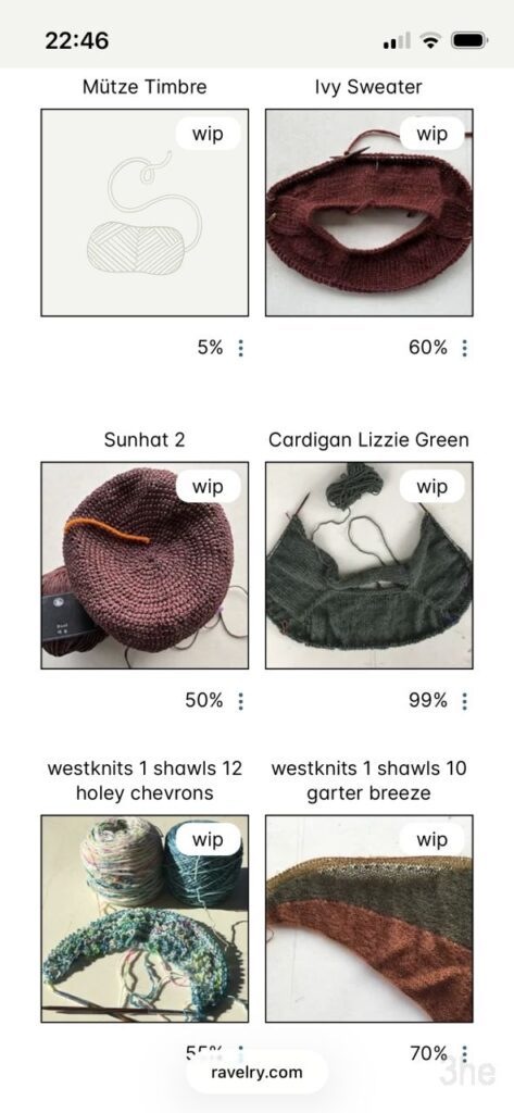 Links seht ihr einen Ausschnitt aus meinen WIPs, der Screenshot vom Handydisplay ist vom 24.01.2026. Die Mütze Timbre und der Ivy Sweater in der ersten Reihe sind inzwischen fertig. Die beiden gerade erwähnten Stricktücher seht ihr in Reihe 3 ganz unten. Der gehäkelte Sonnenhut müsste eigentlich den Status Hibernating haben, denn ich weiß noch nicht so recht wie ich die Krempe mache und ob er mir nicht überhaupt ein bisschen zu eng ist. Derweil ruht er vor sich hin.