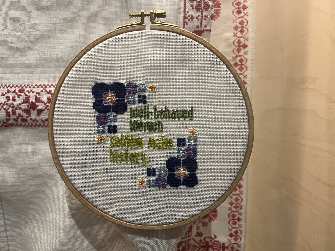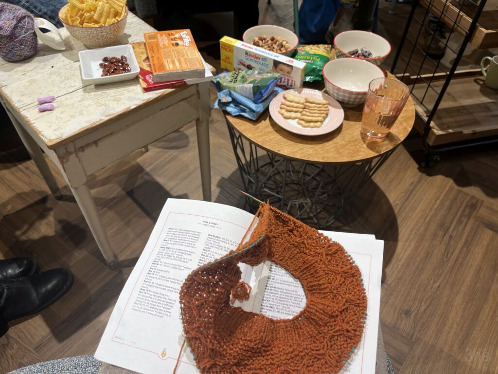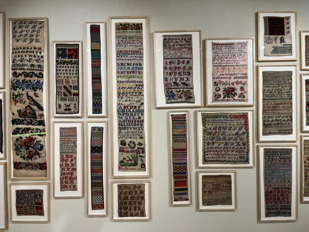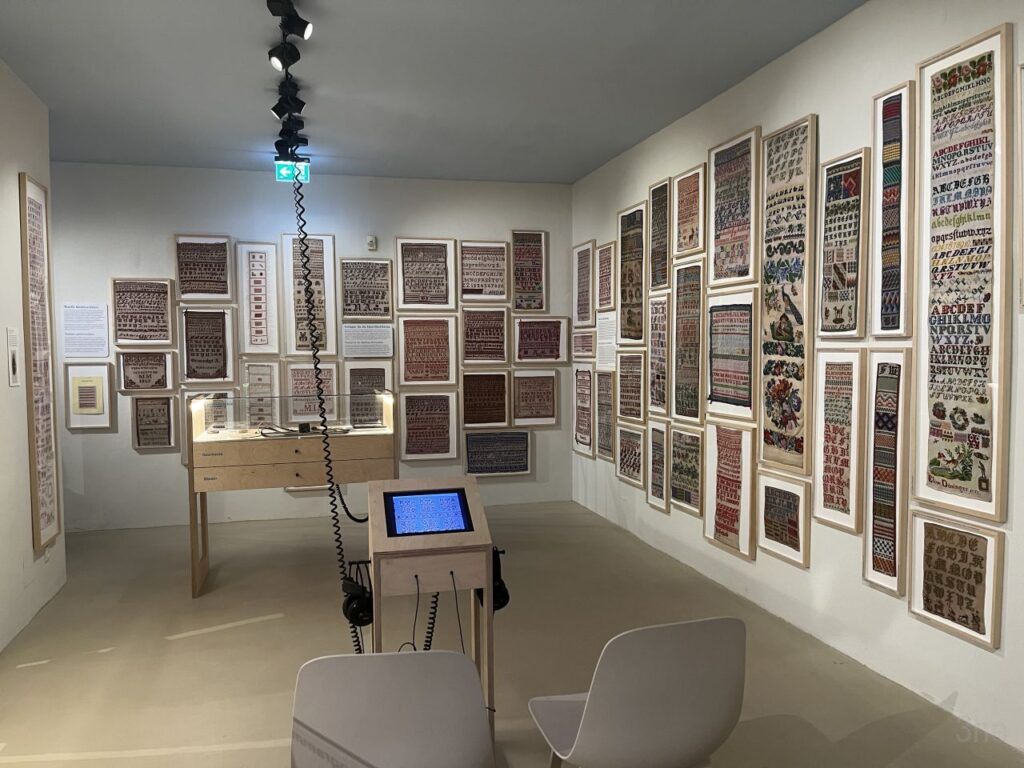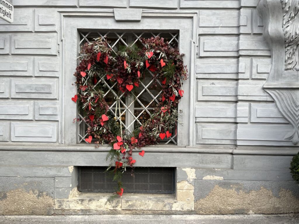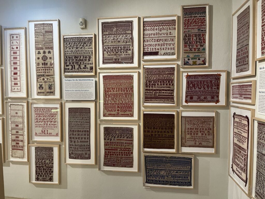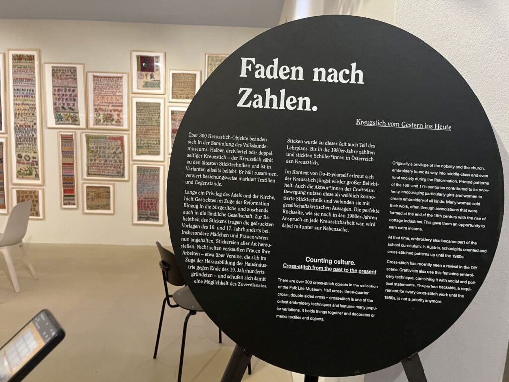 Rauf aufs Rad und rein in die Stadt. In der Paulustorgasse gegenüber dieser hübschen Deko das Fahrrad abgestellt und abgesperrt. Um mich mit der Schwägerin im Volkskundemuseum zu treffen, ich hatte uns beide zu einer Führung angemeldet.Die kleine Ausstellung im Kabinett zu Kreuzstich hatten wir beide bereits letztes Jahr gesehen. Dass nach wie vor monatlich eine Führung dazu angeboten wird, habe ich erst vergangenen Dienstag so richtig registriert. Und mich gleich für die nächste angemeldet, die passenderweise nur 2 Tage später angeboten wurde. Wir waren dann auch die einzigen beiden Teilnehmerinnen an der Führung, was einerseits schade war, andererseits für uns aber auch recht angenehm. Konnten wir doch auch viele Fragen stellen, und haben auch noch so einiges erfahren.Sehr interessant auch, dass die frühen Kreuzsticharbeiten alle sehr bunt waren. Die Einschränkung auf rotes Stickgarn auf weißem Grund kam erst im frühen 20. Jahrhundert. Von wegen die einzig wahre traditionelle Kreuzstichstickerei.In einer Vitrine im Volkskundemuseum Einstimmung auf den nächsten Programmpunkt des Tages.Denn es ist Donnerstag und somit wie jeden Donnerstag außerhalb der Ferien Maschentreff. Wir sind wieder mal eine recht große Runde, und wir hatten interessante Gesprächsthemen und haben viel gelacht. Die Schwägerin allerdings hat nur kurz Hallo gesagt und ist dann zu ihrer Chorprobe aufgebrochen. Ich stricke am dritten Anlauf dieses ansich gar nicht schweren Pullovers, nun sollte die Größe endlich passen.Daheim dann mit etwas Verspätung in den Livestream des Protestsongcontest eingestiegen, der wie jedes Jahr seit 23 Jahren am 12. Februar im Wiener Rabenhoftheater stattfindet und vom Radiosender FM4 veranstaltet wird. Gewonnen hat die junge All-Girls-Band Black SunZet mit dem Punkrocksong „My Body, my Choice“ über Gewalt an Frauen. Ein Thema, das leider nach wie vor sehr aktuell ist, ebenso wie schon wieder viel zu viele Femizide. Bereits im letzten Jahr hatte mit „Jedermann“ von Chovo ein Song zum gleichen Thema gewonnen. Auf der Seite von FM4 gibt es Info zu Black SunZet und Chovo, wer interessiert ist.
