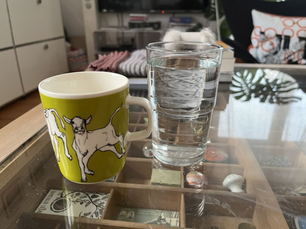 Nachdem der Kater versorgt ist und ich gewaschen und angezogen, gönne ich mir noch ein paar ruhige Minuten mit dem Milchkaffee in der Lieblingstasse auf dem Sofa.
