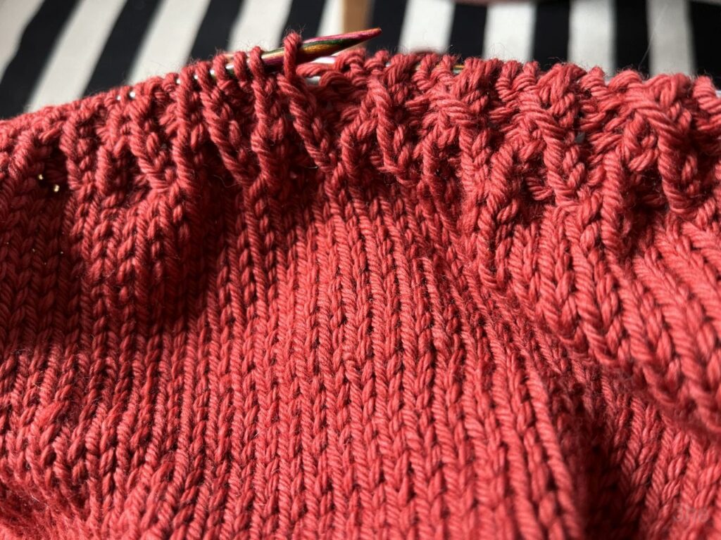 Und stricke noch eine Runde am Bündchen des aktuellen Strickzeugs. Ganz wach war ich wohl noch nicht, denn da ist er schon, mein Freund, der Fehler. Am Beginn der Folgerunde fällt mir auf, dass ich statt 2 re verschr zus und aus dem linken Bein 1 re verschr herausstricken konsequent 2 re verschr gestrickt habe. Die ganze Runde bis auf die ersten 8 Paare. Hurra. Über 200 Maschen zurückstricken oder in der jetzigen Runde ausbessern? Ich habe mich für das nach und nach runterlassen und ausbessern entschieden. Und nicht aufgegeben, bis ich mich durch die ganze Runde gekämpft hatte.