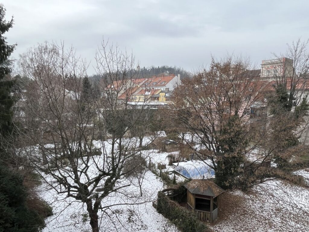 Blick von der Büroküche in den verschneiten Innenhof und zum Schlossberg, den man nun im Winter durch die entlaubten Äste besser sieht.