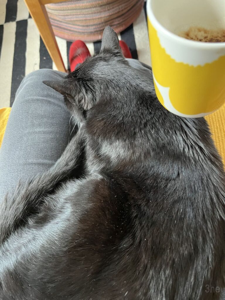 2. Immer ein schöner Anfang mit Kuschelkatze und Kaffee! Ich hoffe, der Installateur hat das Tropfen aufgefangen.
