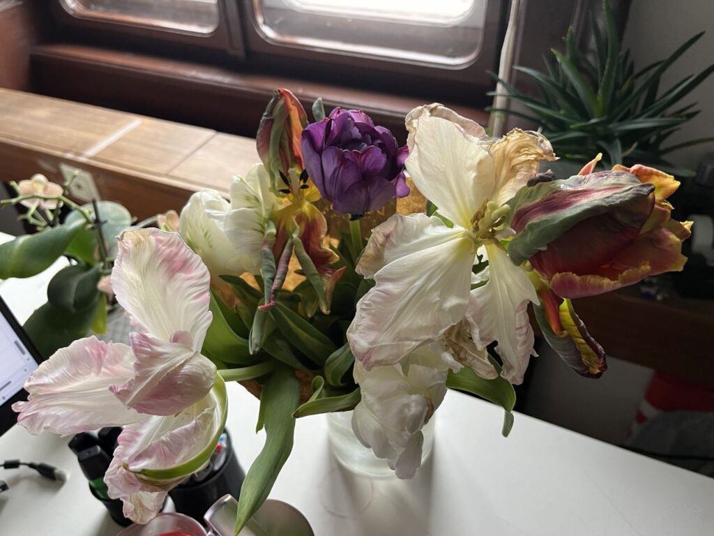 Mehr Foto gibt es heute von der Arbeit nicht. Diese Tulpen haben mich letzte Woche im Supermarkt angelacht. Und dann habe ich sie jeden Abend im Büro vergessen. Jetzt haben sie ihre beste Zeit hinter sich, erfreuen mich aber immer noch jeden Tag.