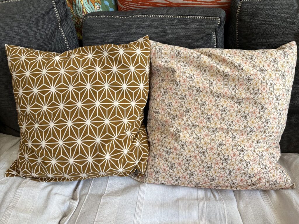 Ich mag das Asanoha-Muster sehr, deshalb habe ich bei der letzten Reise auch ein paar Stoffe mit dem Muster gekauft. Farblich passen sie nun gut zu meiner kleinen Herbstkollektion an Kissenhüllen, deshalb wurden sie jetzt auch frisch überzogen. Ich finde ja, mit unterschiedlichen Kissenhüllen bekommt man am schnellsten einen Stimmungswechsel in Räumen 🙂