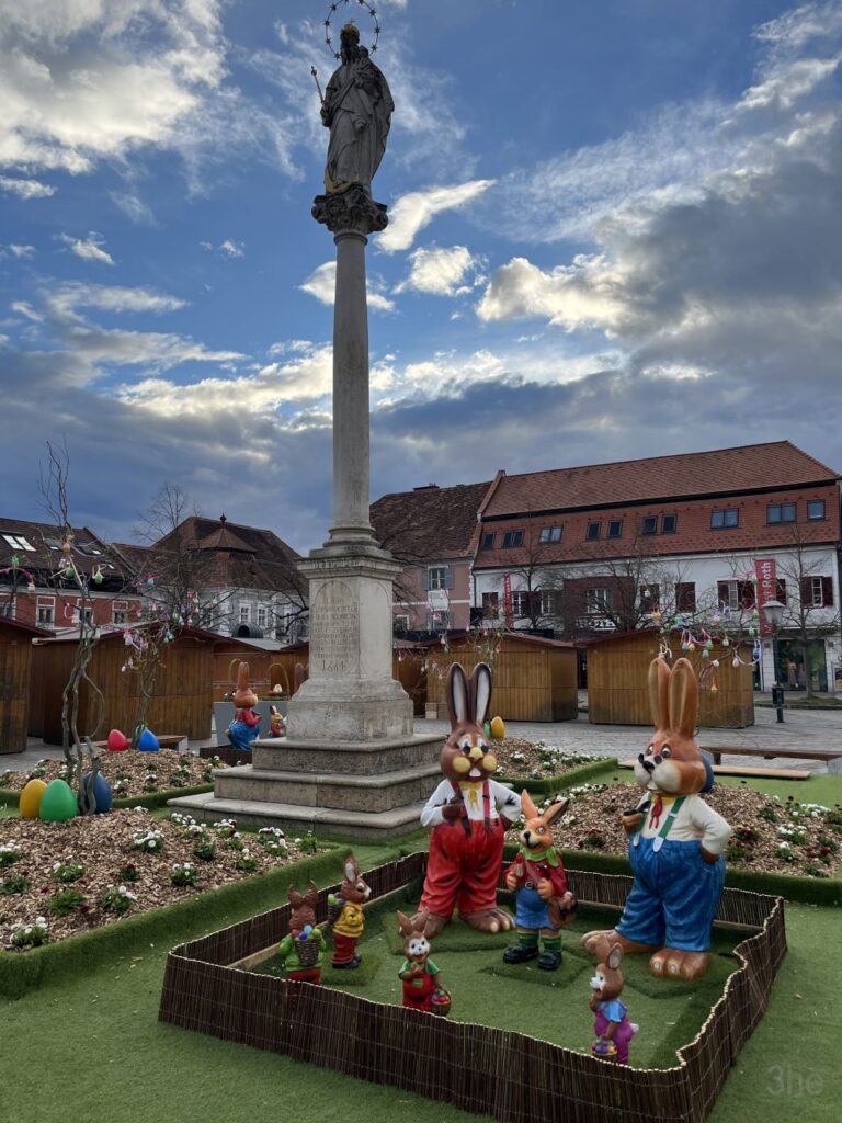 Beim Verdauungsspaziergang nach dem Essen konnten wir überprüfen, dass die reichlich schräge Osterdeko vom letzten Jahr auch heuer wieder den Hauptplatz rund um die Mariensäule zierte.