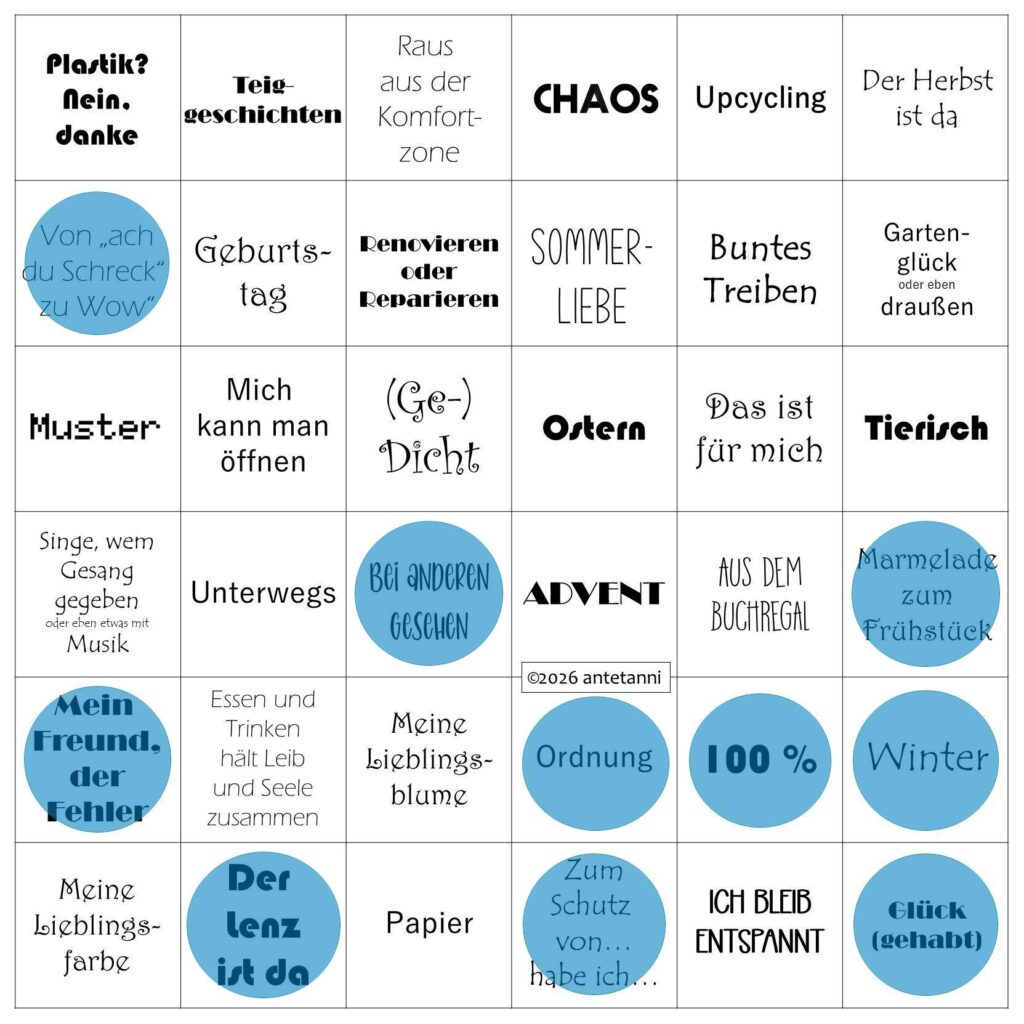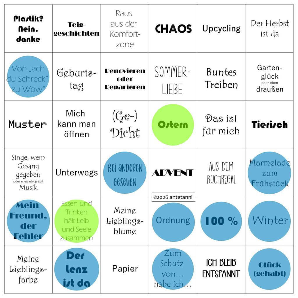 Diese erste Woche im April hatte es in sich. Zumindest was die Arbeit angeht, denn gefühlt habe ich meine wachen Stunden nur im Büro verbracht und bin nur zum Schlafen heimgegangen. Abgabetermine bringen das in der Planung regelmäßig mit sich, nur ich stecke das mit zunehmendem Alter immer schlechter weg. Den Beitrag zum MeMademittwoch habe ich dann in den ganz frühen Morgenstunden geschrieben, weil ich erst kurz nach Mitternacht vom Büro heimkam und eh noch nicht gleich schlafen konnte. Das Heimradeln hat nicht ausgereicht zum Abschalten, und die Kälte hat mich eher wieder aufgemuntert. Alles andere hingegen blieb auf der Strecke. Bei anderen lesen und kommentieren werde ich dann am Wochenende zwischen den diversen familiären Veranstaltungen unterzubringen versuchen, bevor der Wahnsinn in der Woche nach Ostern in eine weitere Runde geht. Womit ich dann auch nicht gerechnet hatte war dass die Linkparty zum Zeigetag 1 beim BINGO! 2026 von antetanni am Karfreitag bereits vorbei war, als ich am frühen Abend dann endlich mal Zeit gefunden hatte zumindest diesen Beitrag auf Schiene zu bringen. So gibt es den Blick auf mein Bingofeld zum ersten Quartal nun eben mit noch ein bisschen mehr Verspätung, da am Ostermontag das am Karfreitag Geschriebene noch mit Ostern ergänzt wurde.