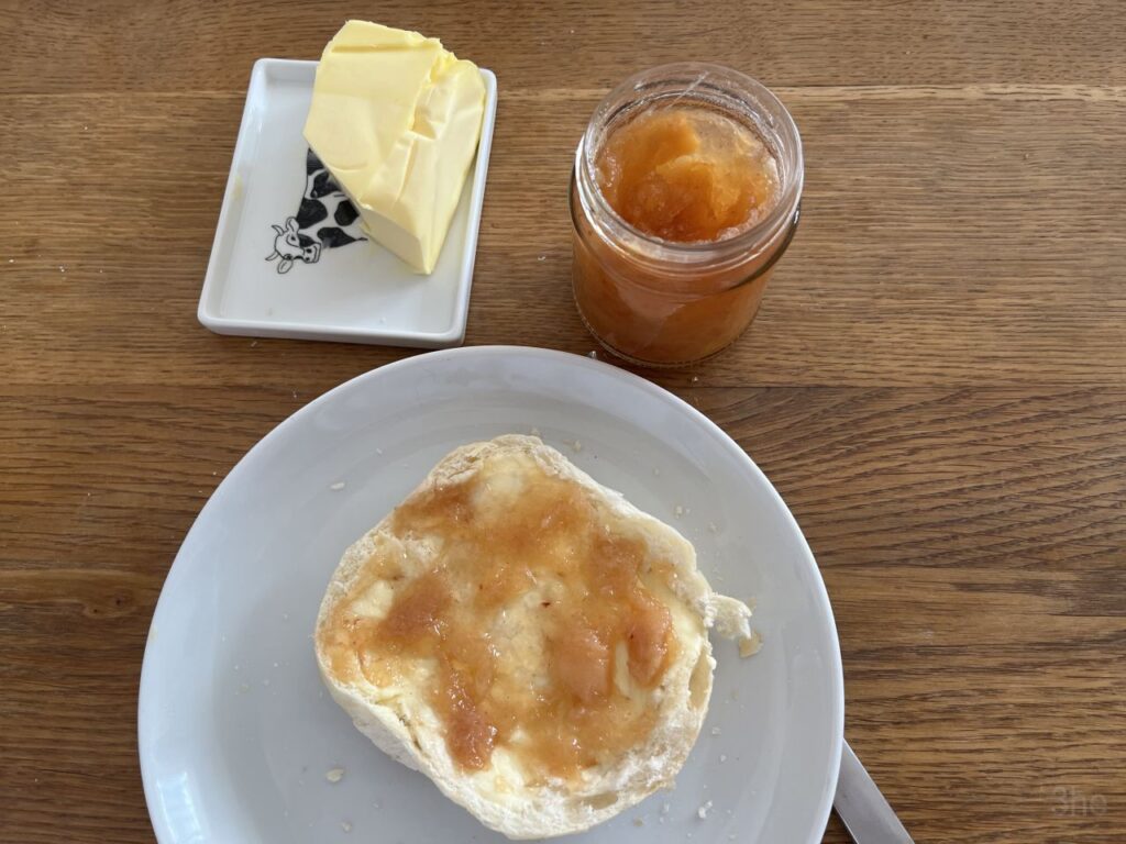 Keinen eigenen Beitrag bekommen hat, obwohl sie es verdient hätte, die tolle Marmelade aus unseren letztjährigen Weinbergpfirsichen. Bei den 12 von 12 im August 2025 konnte man sehen, wie sich die Äste unseres kleinen Pfirsichbaums vor Früchten bogen. Der Beste hat dann aus der reichen Ernte ganz toll schmeckende Marmelade gemacht. Denn leider leider haben die Weinbergpfirsiche eine dicke, bitter schmeckende Schale, so dass der Genuss der reifen Früchte nicht wirklich einer ist. Blanchiert ohne Schale zu Marmelade verarbeitet ist es dann wirklich ein Genuss. Am Palmsonntagswochenende haben wir das letzte verbliebene Glas geöffnet, nach langer Zeit gab es mal wieder Semmeln und Marmelade zum Frühstück.