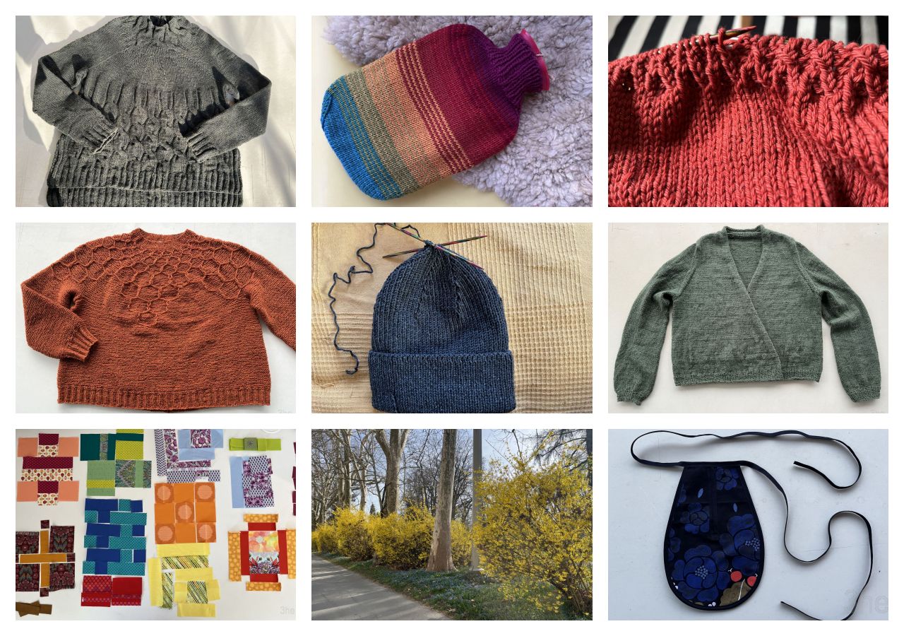 Die kalte Jahreszeit brachte es mit sich, dass die erledigten Felder im ersten Quartal hauptsächlich mit Gestricktem absolviert wurden. So habe ich mir einen Dark Moss Pullover für den Winter gestrickt, außerdem eine bunte Wärmflaschenhülle zum Schutz von zarter Haut vor heißer Wärmflasche. Bei einem weiteren Strickpullover hat sich mein Freund der Fehler eingeschlichen, wurde aber rechtzeitig entdeckt. Glück gehabt habe ich dann bei eben diesem Pullover und bei einer Mütze, weil die Wolle gerade eben so bis auf ein paar Zentimeter beim Abketten gereicht hat. Weitere Mützen und ein Strickjacken-UFO wurden dann auch zu 100% fertig. Und noch ein Strickpullover entstand, der nach anfänglichem „Ach du Schreck“ und mehrmaligem Auftrennen und Adaptieren doch noch zu einem „Wow“ wurde. Für mein Jahresprojekt, den Tula Pink City Sampler Quilt, arrangiere ich die zugeschnittenen Stoffflecken für die einzelnen Patches immer in der erforderlichen Anordnung am Nähtisch, bis ich mehrere zusammenhabe und sie in dieser Ordnung hintereinander wegnähe. Noch etwas habe ich genäht, Taschen zum Umbinden, eine davon habe ich zuerst bei anderen gesehen. Und beim Gang zur Post schrie mir die blühende Natur mit aller Macht entgegen „Der Lenz ist da„.