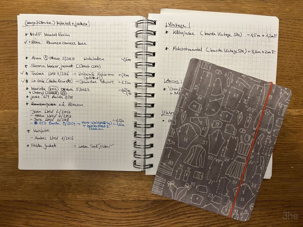 Und auch für den nächsten Punkt brauche ich Papier, vorzugsweise in Form eines gebundenen Etwas mit Blättern, nämlich einem Notizbuch. Davon schwirren etliche durch die Gegend, in denen Notizen für meine Strickprojekte ebenso notiert werden wie Ideen für Quilts, Taschen, Kleidung, aber auch Geschenklisten für Weihnachten. Letztes Jahr habe ich dann begonnen, mir gezielt zu notieren, welche Schnitte und welche Stoffe ich für Kleidung für mich verwenden möchte.