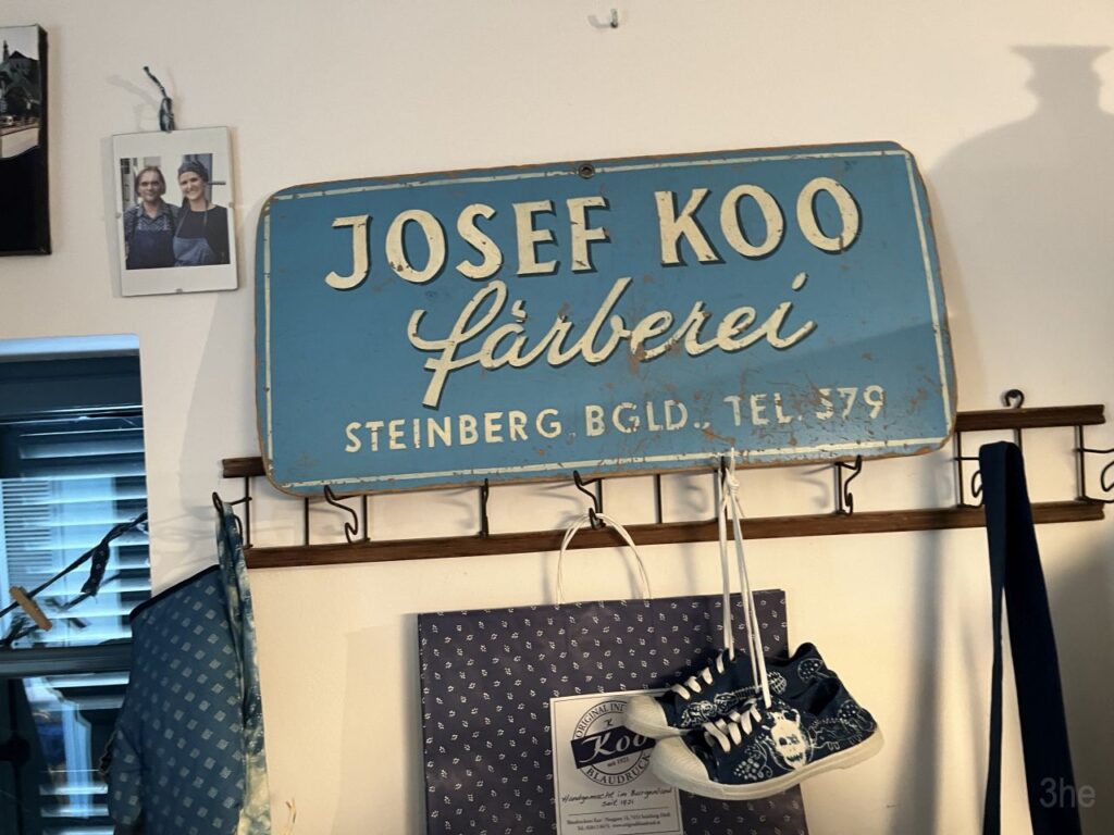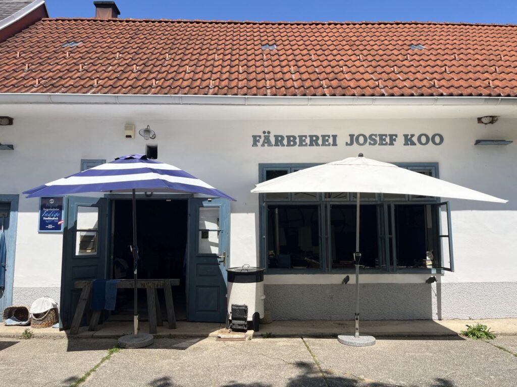 Die Färberei Josef Koó besteht seit 1921 an diesem Standort. Also genau so lange wie das Burgenland zu Österreich gehört. Der namensgleiche Großvater des heutigen Blaufärbers hatte damals in den hofseitigen Nebengebäuden eine Färberwerkstatt gegründet und eingerichtet. Auch heute noch sind die Räumlichkeiten und Gerätschaften genauso wie damals, und die Herstellung ist nach wie vor überwiegend Handarbeit. Der nunmehrige Blaufärber hatte bereits ein Leben als Graphiker in Wien aufgebaut, bis er sich mit Ende 40 entschied, den Betrieb von den Eltern zu übernehmen und mit seiner Frau, einer Künstlerin, wieder zurück ins Burgenland zog. Auch, um das Wissen und das Handwerk um die Blaufärberei nicht aussterben zu lassen. Denn die Färberei Koó ist die letzte Blaufärberei im Burgenland und eine von nur zwei verbliebenen in Österreich (die andere ist Blaudruck Wagner in Oberösterreich). Die Blaudruckfärberei in Gutau im Mühlviertel ist nur noch museal erhalten. In Ungarn, der Slowakei, Tschechien und auch in Deutschland (Niedersachsen, Thüringen und Bayern) gibt es noch ein paar wenige Betriebe. Ländergrenzenübergreifend wurde der Blaudruck in all diesen Ländern als gemeinsames Kulturgut 2018 in die Repräsentative Liste des immateriellen Kulturerbes der Menschheit aufgenommen. (Nachzulesen auf Wikipedia, den Artikel zu Blaudruck habe ich neben der Koó-Homepage auch herangezogen, um querzuprüfen, ob ich mir alles richtig gemerkt hatte).