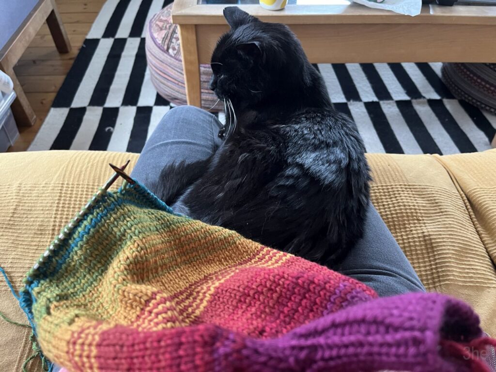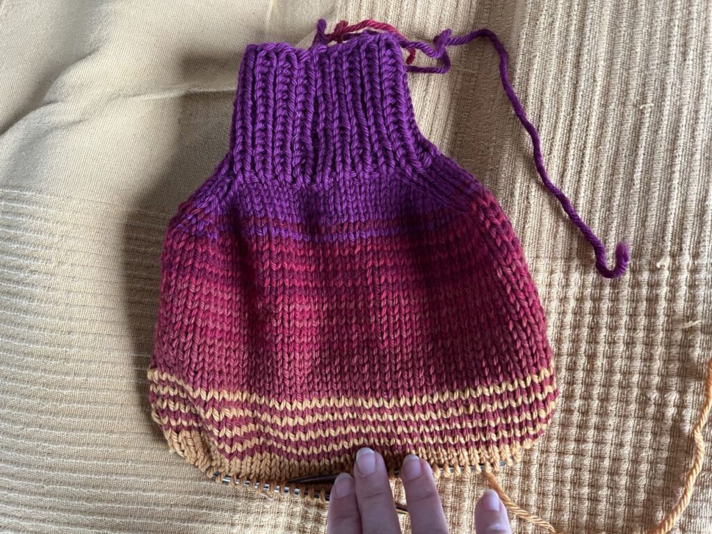 Also fing ich einfach mal an. Zum Glück gibt es in unserem Haushalt auch Wärmflaschen (ich wüsste sonst gar nicht wie ich meine Eisfüsse des Nachts warmbekommen würde), die habe ich zum Abmessen und Anpassen während des Strickens daneben liegen gehabt. Für das Halsbündchen habe ich 40 Maschen angeschlagen und im 1×1 Rippenmuster gestrickt, bis mir die Höhe passend schien. Die Schultern habe ich mit linksgerichteten und rechtsgerichteten Zunahmen in jeder Runde ausgeformt, bis ich eine Maschenanzahl von 80 Maschen hatte und der Umfang passte. Die Farbwechsel habe ich nach Lust und Laune vorgenommen, wobei doch meist 4 Streifen in jeder Farbe beim Wechsel herauskamen.