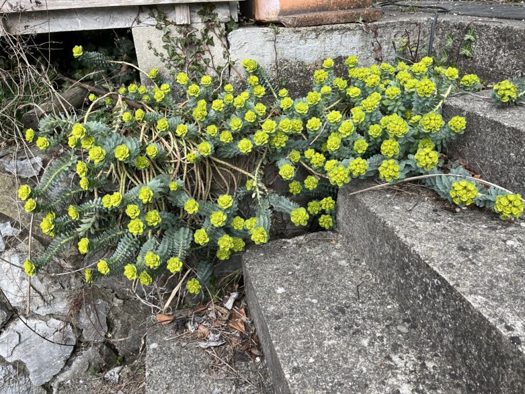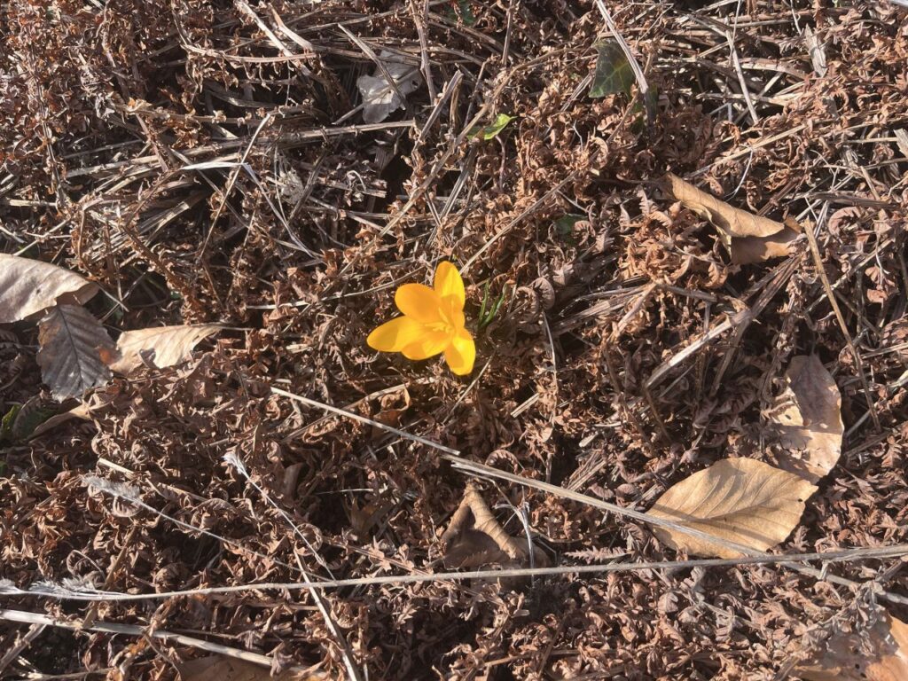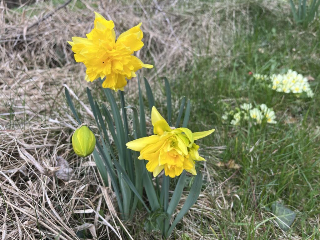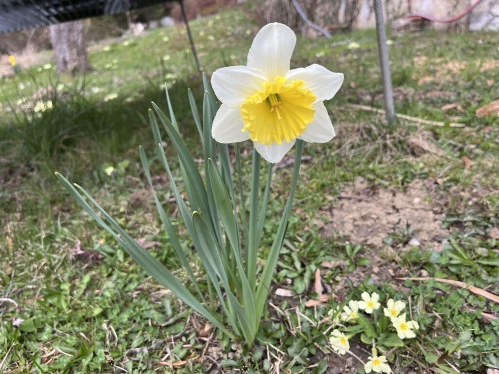 Ein gelber Krokus kämpft sich durch das vorjährige Farbkraut im Farnbeet neben der Straße.Eine gefüllte Narzisse im Obstgarten. Und eine von vielen zweifärbigen Narzissen im Obstgarten. Die der Beste alljährlich beim Rasenmähen verflucht, aber doch brav rundherum mäht. Und die auch das einzige sind, was die Wühlmäuse überlebt.Die grüngelbe Wolfsmilch an der Stiege zum Obstgarten.Und natürlich unsere weiße Sternmagnolie. Mit jedem Jahr wird sie größer und schöner.
