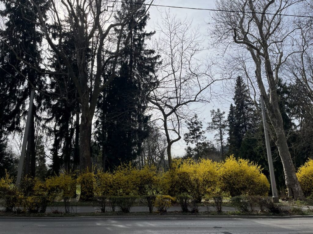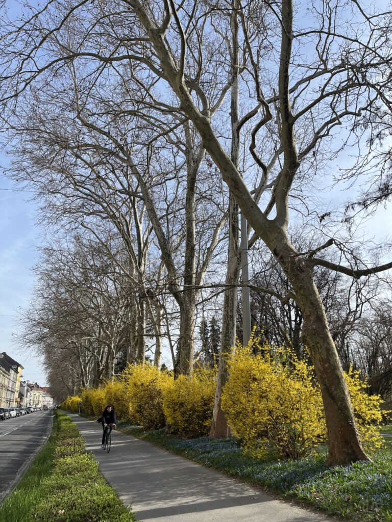 Ich biege nach links in die Harrachgasse ab und sehe vom Glacis her bereits die gelben Forsythien entlang des Stadtparks leuchten.