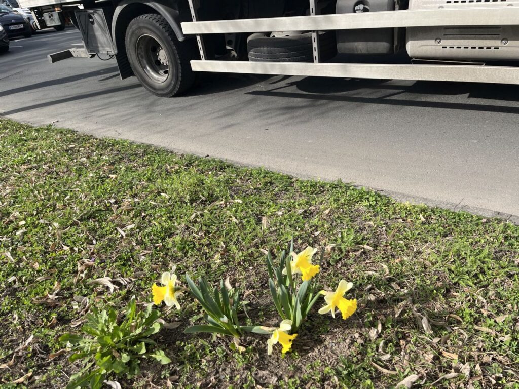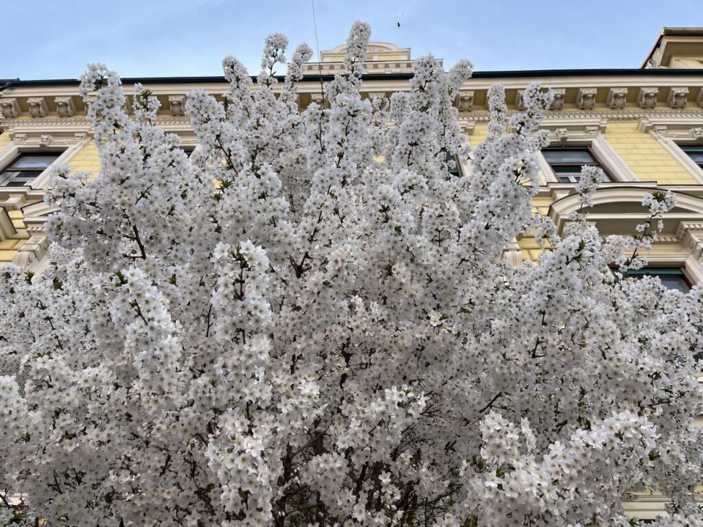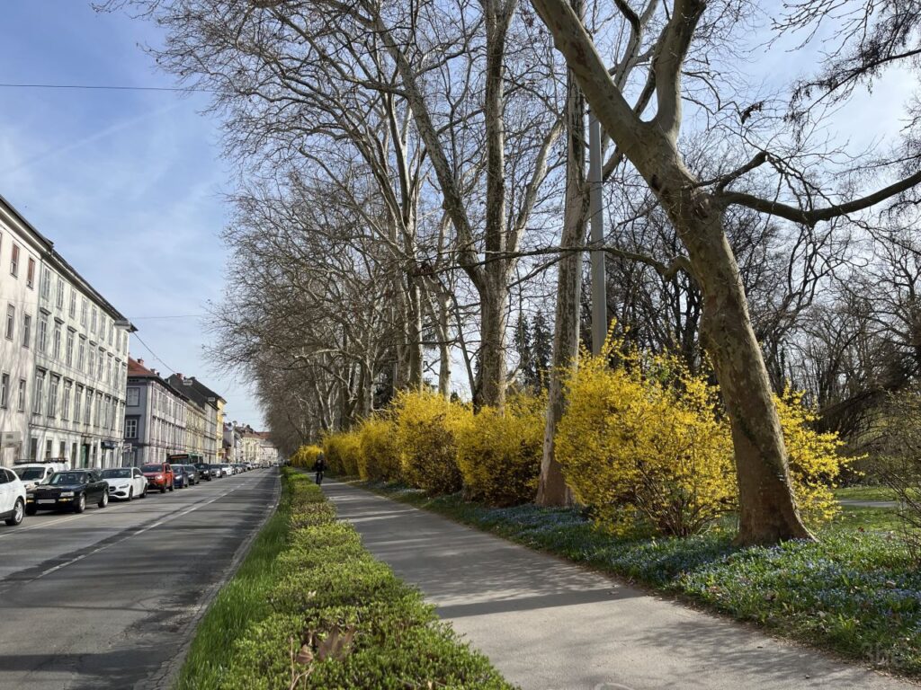 Beim Verlassen der Post lacht mich dieses gelbe Plakat zu den Menschenrechten auf der anderen Straßenseite an. Graz trägt übrigens den Titel Stadt der Menschenrechte, hoffen wir mal, dass sich auch alle Einwohner dessen und deren weiterhin bewusst sind.Bereits am Hinweg ist mir in der Bergmanngasse dieser blühende Baum aufgefallen. Aber wie am Glacis auch hier andere Straßenseite und zu viel Verkehr. Den Rückweg mache ich deshalb auf der passenden Straßenseite und kann aus der Nähe dann auch das Summen und Brummen der vielen Bienen und Hummeln hören. Und wie passend, ist die Hausfassade dahinter zartgelb.Gegenüber des Geidorfplatzes lachen mich die weißen Blüten der Magnolienallee entlang der Parkstraße an. Es ist so schön, den kleinen Schlenker gönne ich mir jetzt.Auch die Parkstraße gehört zum Verkehrsring um die Altstadt, ist deshalb ebenso viel befahren. Die gelben Osterglocken trotzen dem Verkehr, der nah an ihnen vorbeirauscht.Die Magnolienreihe entlang der Parkstraße, vom Europaratweg Richtung Geidorfplatz gesehen. Das ist nur die eine Hälfte der Baumreihe, in die andere Richtung setzt sie sich bis zur Jahngasse fort. Drei Punkte zum Foto: