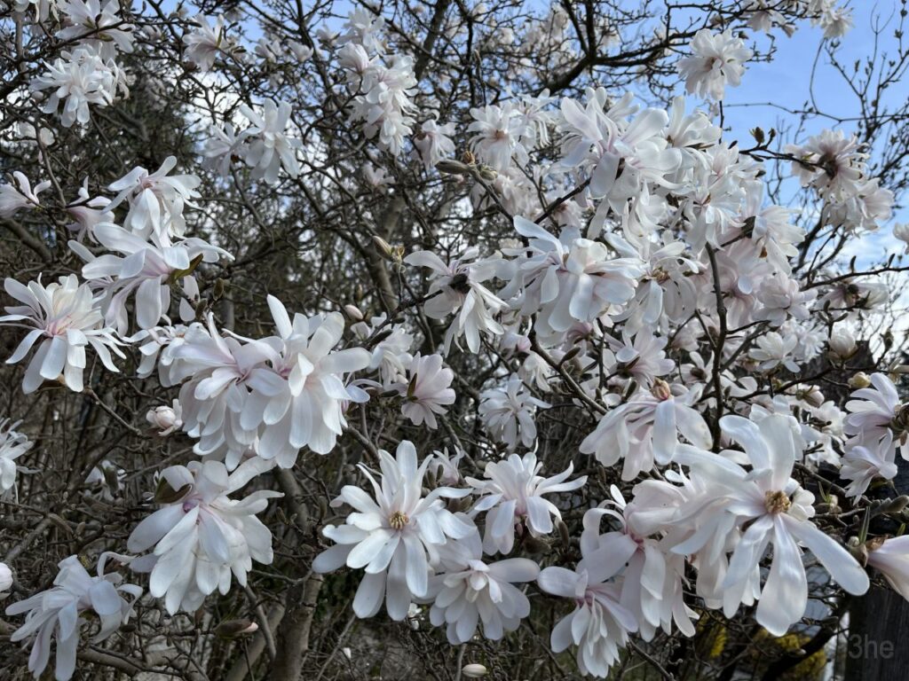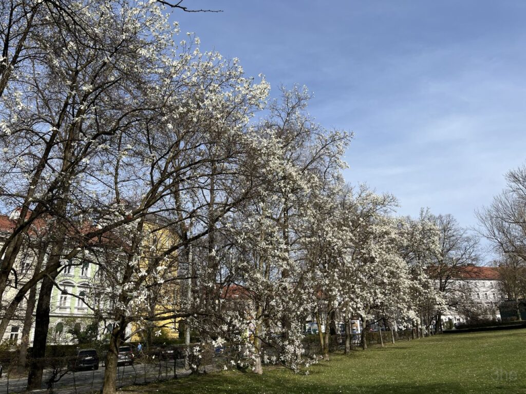 Laut Baumkataster der Stadt Graz handelt es sich bei den Magnolien überwiegend um Baummagnolien, Magnolia kobus. Mittendrin mit der Nummer 17194 eine einzelne Yulan-Magnolie, Magnolia denudata. Allesamt bereits am Abblühen.