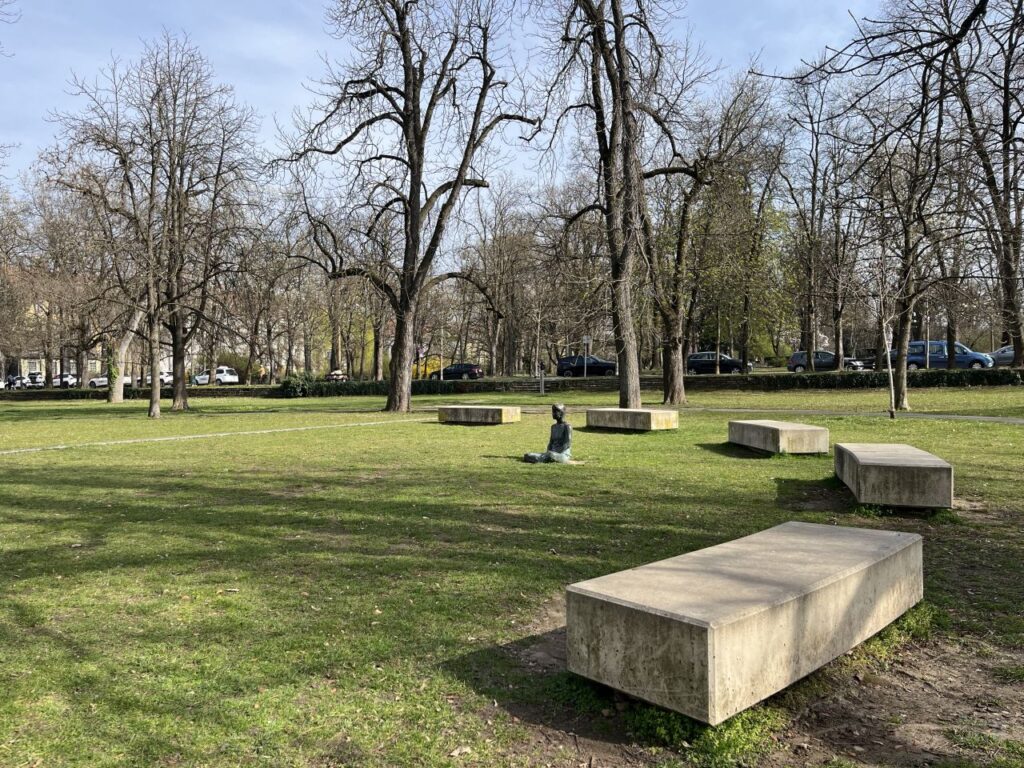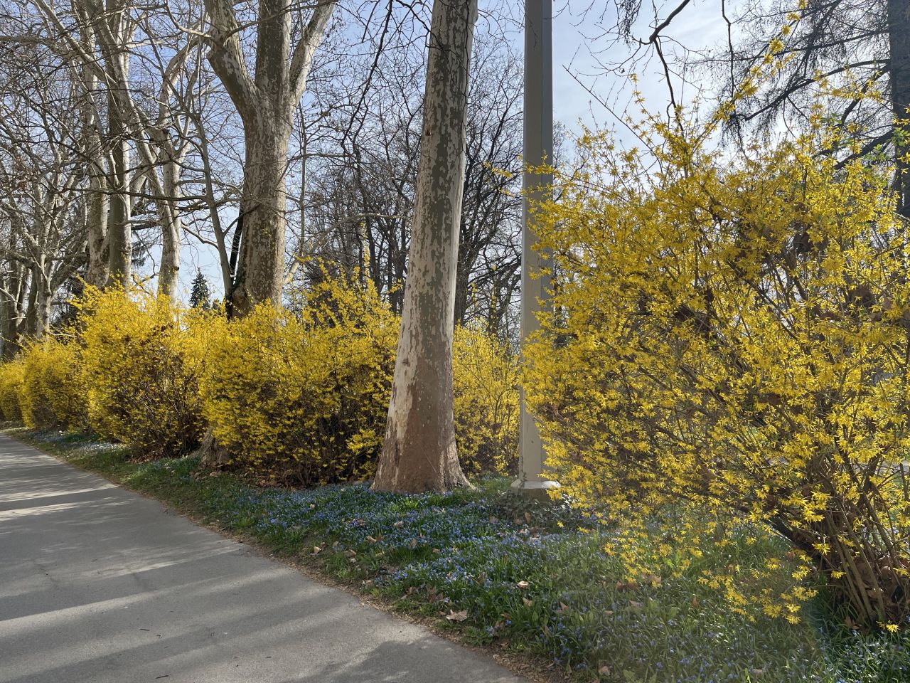 Noch ein Baum, der sich auch gut bei Astrids Baumfreunden machen würde. Im Baumkataster ist der Baum mit der Nummer 17063 als Hängehainbuche (Carpinus betulus) bezeichnet. Leider ist auch hier, wie schon bei den Magnolien, kein Pflanzjahr eingetragen, noch nicht mal ein ungefähres.Was frau so alles sieht und neu entdeckt, wenn sie einmal zu Fuß mittendurch unterwegs ist und nicht mit dem Fahrrad außenrum entlangfährt. Die Skulptur innerhalb des Kreises aus Kastanienbäumen und Betonblöcken hatte ich bisher auch noch nicht wahrgenommen.Auf der dem Parkpflegewerk zum Stadtpark beigefügten Liste der Denkmäler, Gedenktafeln und Plastiken im Stadtpark habe ich die Figur nicht gefunden. Bei der Suche dann jedoch einen sehr interessanten Blog zu allerlei Interessantem über Graz entdeckt, und dort findet sich dann auch Info zur Skulptur. Und auch zum Betonquader davor, zusammen mit dem schmalen, in den Boden eingelassenen Inschriftstreifen das eigentliche Denkmal. Beim zwischen 1988 und 2005 errichteten Wasserdenkmal „Goldwasser“ von Fedo Ertl handelt es sich um ein nie gänzlich fertiggestelltes Monument anlässlich der Fertigstellung der Wasserversorgungsanlagen vom Hochschwab. Hätte der Quader doch eigentlich vergoldet werden sollen, um so auf die Kostbarkeit sauberen Trinkwassers aufmerksam zu machen. Die besondere Qualität des Grazer Trinkwassers wird dann auch regelmäßig in den ebenso zum Denkmal gehörenden Edelstahlstreifen eingraviert. Und ich habe wieder was gelernt.Zurück am Glacis mache ich einen weiteren Versuch, die blühende Forsythienhecke entlang des Radwegs am Glacis auf Bild zu bannen. Auch der Radweg ist viel befahren, das Fotografieren gestaltet sich ähnlich schwierig wie über die Straße. Einen guten Winkel zum Fotografieren würde ich nur mitten auf der Straße bekommen. So todesmüde bin ich dann aber doch nicht. Dafür bin ich nun nah an den an dieser Stelle flächendeckend blühenden Blausternchen (Scilla).Die beiden Fahrspuren in die Gegenrichtung sind nur wegen der Ampel gerade mal so leer. Dafür staut es sich auf den beiden Spuren stadtauswärts.Ist diese Forsythienreihe in Verbindung mit den hohen Platanen nicht eine Pracht? Jedes Jahr um diese Zeit kann ich mich nicht sattsehen an diesem Bild. Und jedes Jahr wieder scheitere ich am Festhalten des Bildes. Wer dieses Bild also selbst in natura sehen möchte, sollte Graz in der zweiten Märzhälfte einen Besuch abstatten.