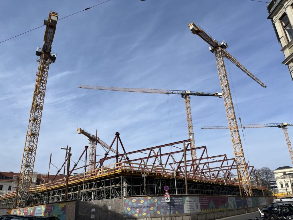 Das erste Gelb gibt es bei der Baustelle des zukünftigen Center of Physics vorne an der Ecke zu sehen. Nicht nur die Schaltafeln für die Betonierarbeiten, auch die vielen Kräne sind Gelb. Es geht flott dahin, das Bauwerk hat nun die tiefe Baugrube verlassen und ragt bereits über den mannshohen Bauzaun hinaus.