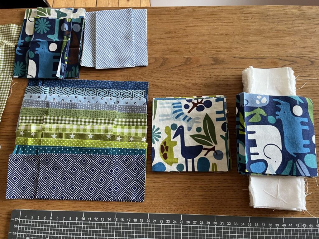 Und habe begonnen Quadrate und Streifen zuzuschneiden. Quadrate in 12x12cm aus den beiden 2D-Zoo Farbstellungen. Und Streifen in einer Breite und zwei Längen aus den Begleitstoffen. Die Streifen sollten die Quadrate rahmen und ein Fertigmaß (ohne Nahtzugabe) von 20x20cm ergeben.