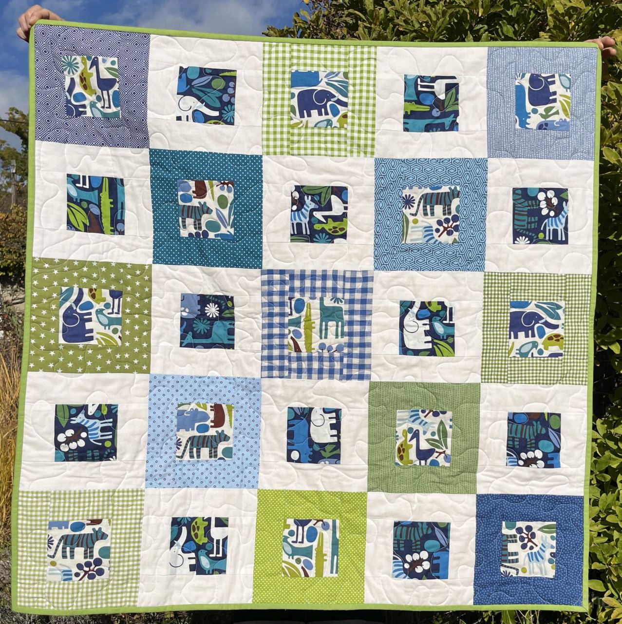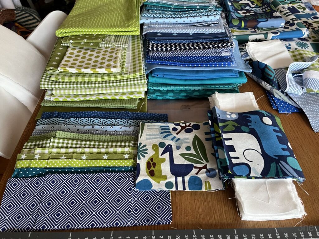 Zur Hochzeit letztes Jahr hatten sie und ihr Mann das Farbmotto Blau-Grün-Gold ausgegeben. Und ich wusste dass Blau und auch Grün ihre Lieblingsfarben waren. Und noch besser, ich hatte zwei verschiedene Farbstellungen des schönen Stoffes 2D-Zoo in Blau und Grün im Vorrat, die genau auf diese Gelegenheit gewartet hatten. Also habe ich in der Patchworkabteilung meines Stoffschranks weitere Stoffe in Blau und Grün, die mir passend erschienen, zusammengesucht.