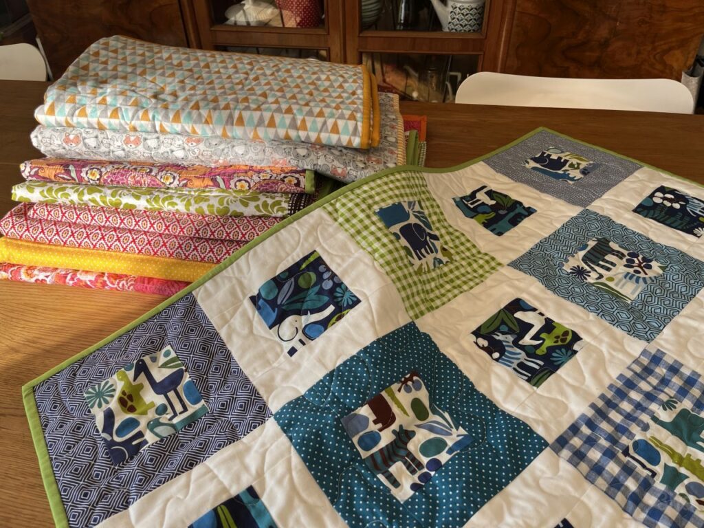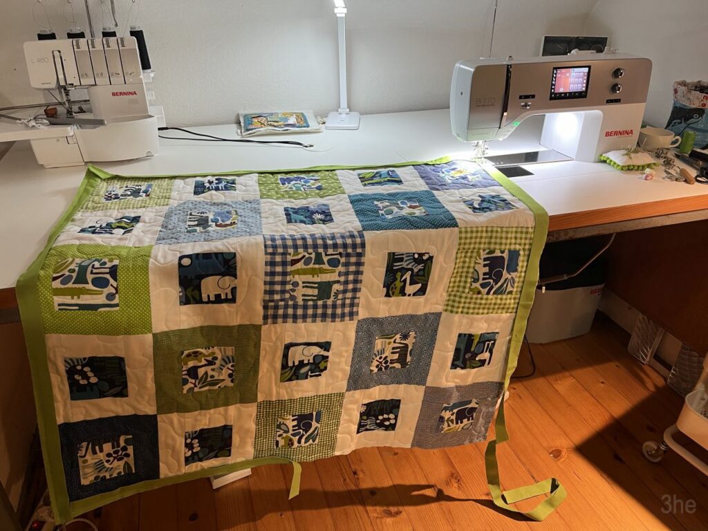 Vom Nähprozess selbst gibt es keine Fotos, habe ich vergessen. Inzwischen war es Ende August und der neue Erdenbürger war geboren. Also habe ich mich ans Quilten gemacht. Quilten ist für mich immer eine Zäsur, denn ich kann mich oft lange nicht entscheiden, wie ich quilten möchte. Dasselbe hier, deshalb habe ich dann auch erst nach der Geburt gequiltet. Da wurde es nämlich wirklich Zeit…