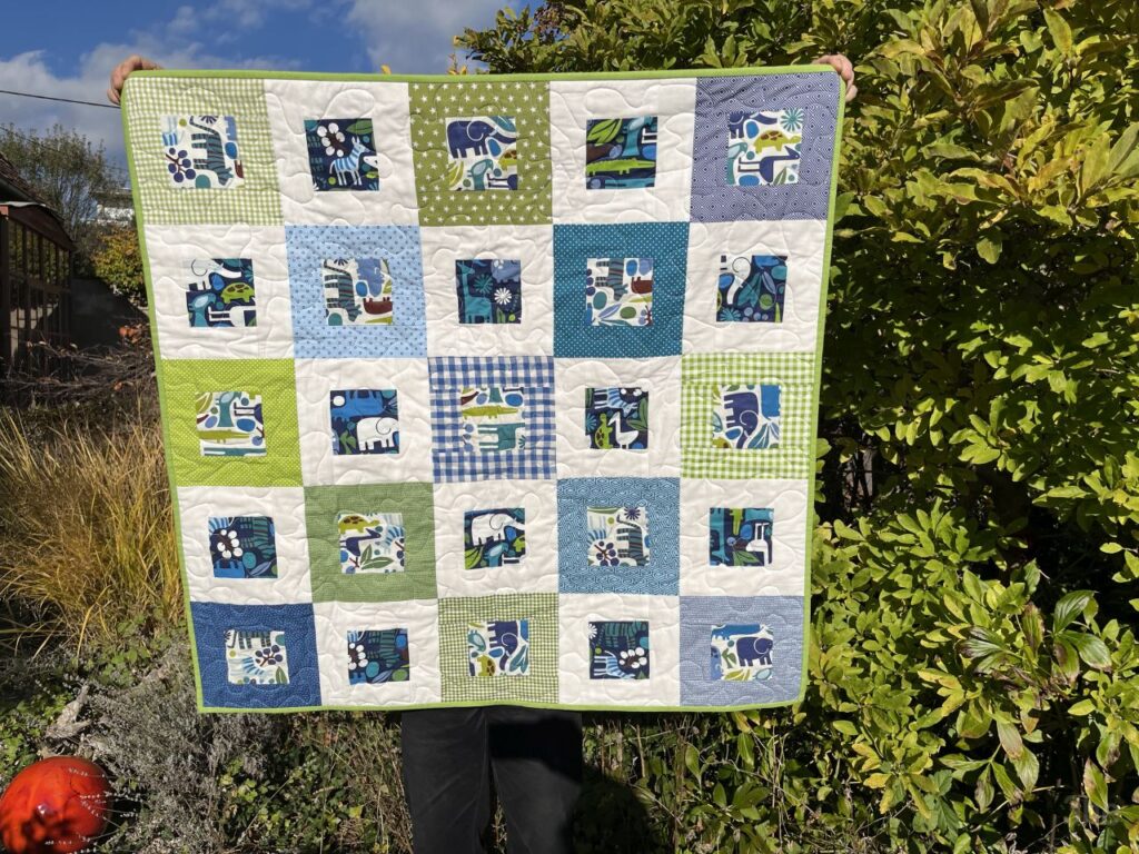 Ich mag Stoffe auswählen und arrangieren, die Tops sind dann immer recht schnell zusammengefügt. Mit dem Quilten tue ich mich schon schwerer 😉 Die Farbwahl war diesmal nicht nur durch den Hauptstoff vorgegeben, sondern auch durch die Farbvorlieben der Eltern. Die sich in meinem Stoffschrank auch gut wiederfinden 😉