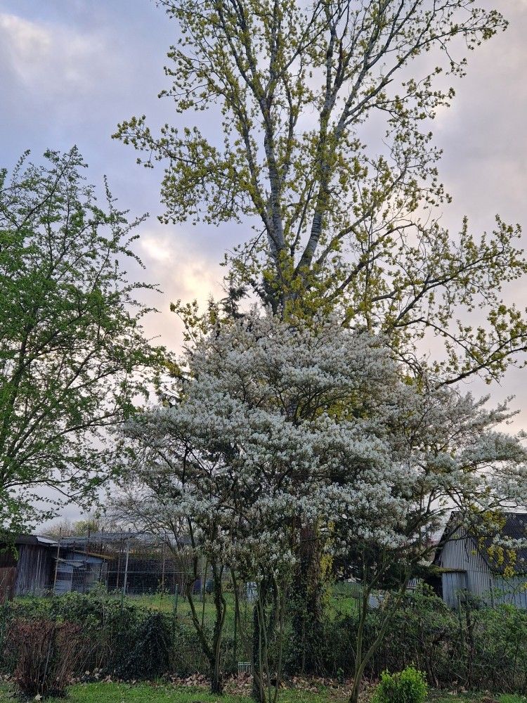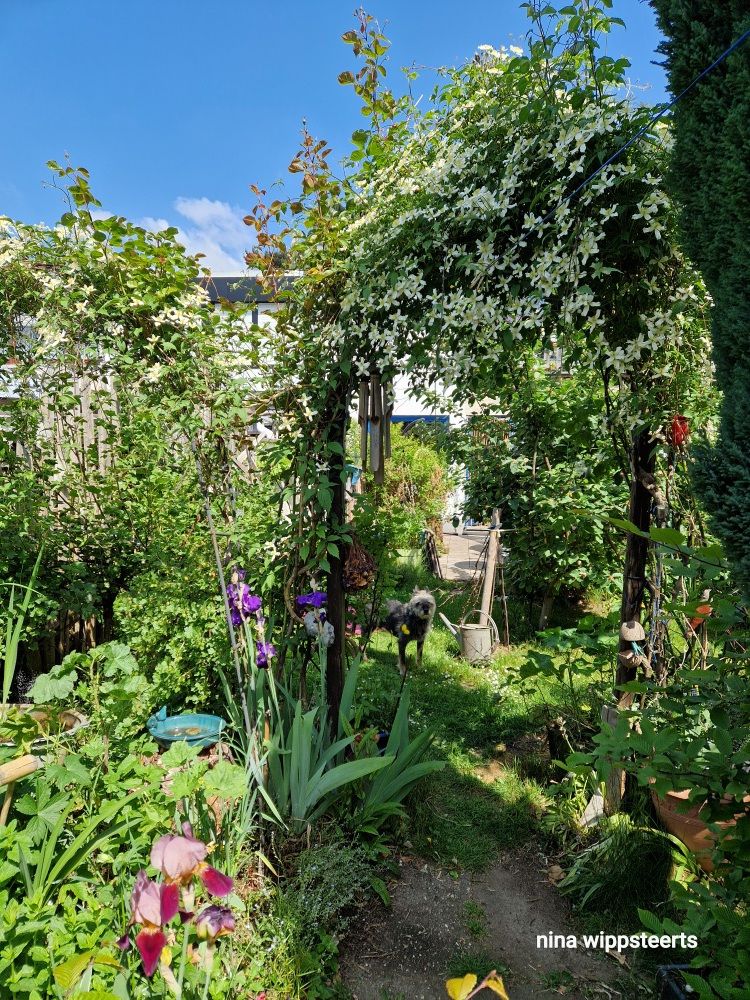 Da freut man sich doch auf das Heimkommen 🙂Nicht ganz so viel Freude macht er hier und der Rest seiner Familie. Mindestens 5 Rehe wohnen im benachbarten Graben, und in den letzten Jahren haben sie auch entdeckt, dass es in meinem Garten viel Schmackhaftes gibt. Einerseits finde ich es schon sehr toll, dass mitten in der Stadt Rehe nahezu unbehelligt leben können, aber müssen sie immer meine Blütenknospen fressen?Meine Tulpen habe ich die letzten Jahre nicht mehr blühen sehen. Diese spatblühenden Tulpen hier zwischen Straße und Garage haben es nur bis zur Blüte geschafft, weil ich ein Drahtgitter drüber geworfen habe. Tulpen hinter Gittern quasi.Deshalb haben wir den Pfingstmontag auch mit Tomatenhaus einigermaßen rehsicher machen verbracht. Neben jäten, Erde lockern, Kompostmiete durchwerfen und Kompost verteilen und Tomaten, Paprika, Chili und Zucchini einsetzen. Wenn jetzt noch die Schnecken die Zucchini in Ruhe lassen würden, könnten wir vielleicht endlich wieder mal Gemüse ernten. Der alte Maschendrahtzaun zum Nachbarn mit 2 Reihen Stacheldraht oben ist übrigens genauso alt wie das Haus und hält die Rehe mitnichten ab. Den nehmen sie fast aus dem Stand.Die japanische Strauchpfingstrose wird dafür zum Glück in Ruhe gelassen. Und dankt es mit schwenderischer Fülle. Heuer dauerte die Blüte nicht ganz so kurz wie sonst immer, vermutlich weil es so kalt war.Die weiße Päonie im weißen Beet (ja, ich habe ein weißes Beet, Sissinghurst lässt grüßen 😉 ) blüht zeitlich versetzt erst nach der dunklen. Verlängerte Freude also. Die Staudenpfingstrosen sind dafür heuer besonders spät dran, noch sind sie nicht wirklich aufgeblüht.Die Maiglöckchen neben dem Gartentor sind auch schon wieder abgeblüht.Ebenso der Flieder. Von dem es übrigens noch weitere Farben gibt, neben weiß noch helllila, purpur und lila mit weißem Rand. Der Schneeball blüht dafür noch, wunderschöne weiße Blütenbälle und komplett durchlöcherte Blätter, jedes Jahr das Gleiche.Und natürlich die Akeleien. Seit Wochen tanzen sie durch den Garten und erfreuen unser Herz. Achtung Bilderflut.Jetzt sind sie allerdings langsam am abblühen.Dafür beginnen nun die Schwertlilien,die frühen Taglilien,Frauenmantelund die ersten Rosen zu blühen. Die hier ist eine der wenigen reinweißen und heißt Schneewittchen bzw. Iceberg. Diese hier im Topf und eine als Kletterrose gezogene sind die einzigen verbliebenen dieser Sorte. Da ich jedoch ursprünglich überhaupt keine Rosen wollte, ist es eh ein Wunder, dass doch ein paar recht hartnäckig überleben.Auch die Gloire de Dijon an der Garagenwand. Und die noch von der Großmutter meines Mannes stammenden purpurroten Kletterrosen, von denen mehrere Stöcke sich über den Garten verteilen und ihre Pracht entfalten. Allerdings momentan noch nicht, bis auf vereinzelte gerade sich öffnende Blüten wird das mit der Rosenblüte erst im Juni was.Bis dahin sorgt die Weigelie für den roten Farbtupfer in der Blütenhecke.Und ich setze mich unter den Ginkgo und genieße noch ein bisschen den Feier(tags)abend.