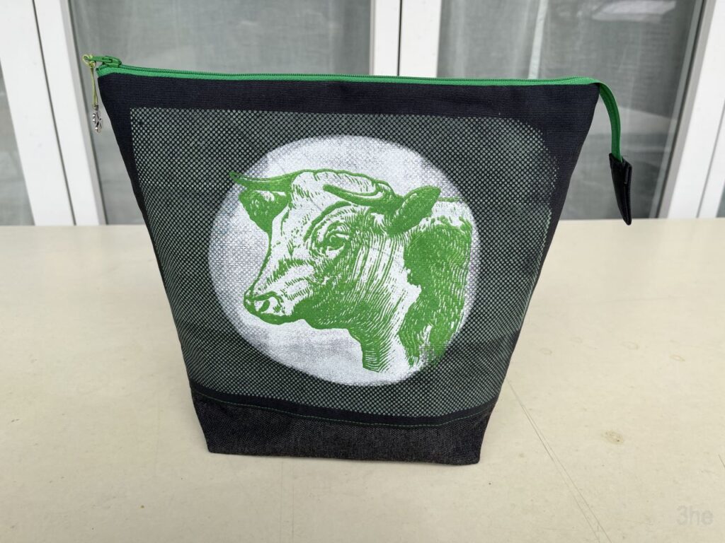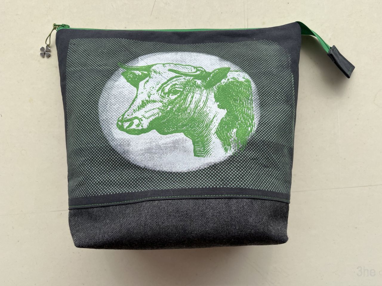 Viel komme ich derzeit nicht zum Nähen, aber immerhin ein Tascherl aus einem der beim Siebdruckkurs letztes Jahr bedruckten Stoffe habe ich geschafft. Schließlich stehen Ende April, Anfang Mai ein paar Geburtstage an. Und eines der Geburtstagskinder hat Kühe. Da passte der grüne Kuhkopf doch ganz wunderbar.