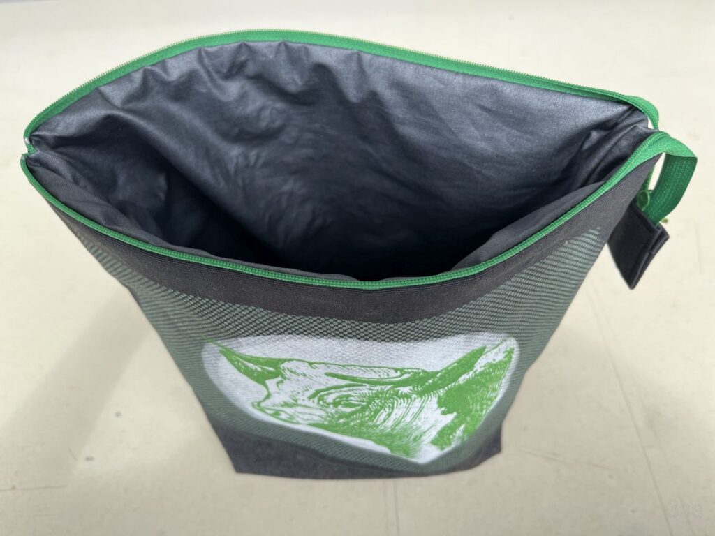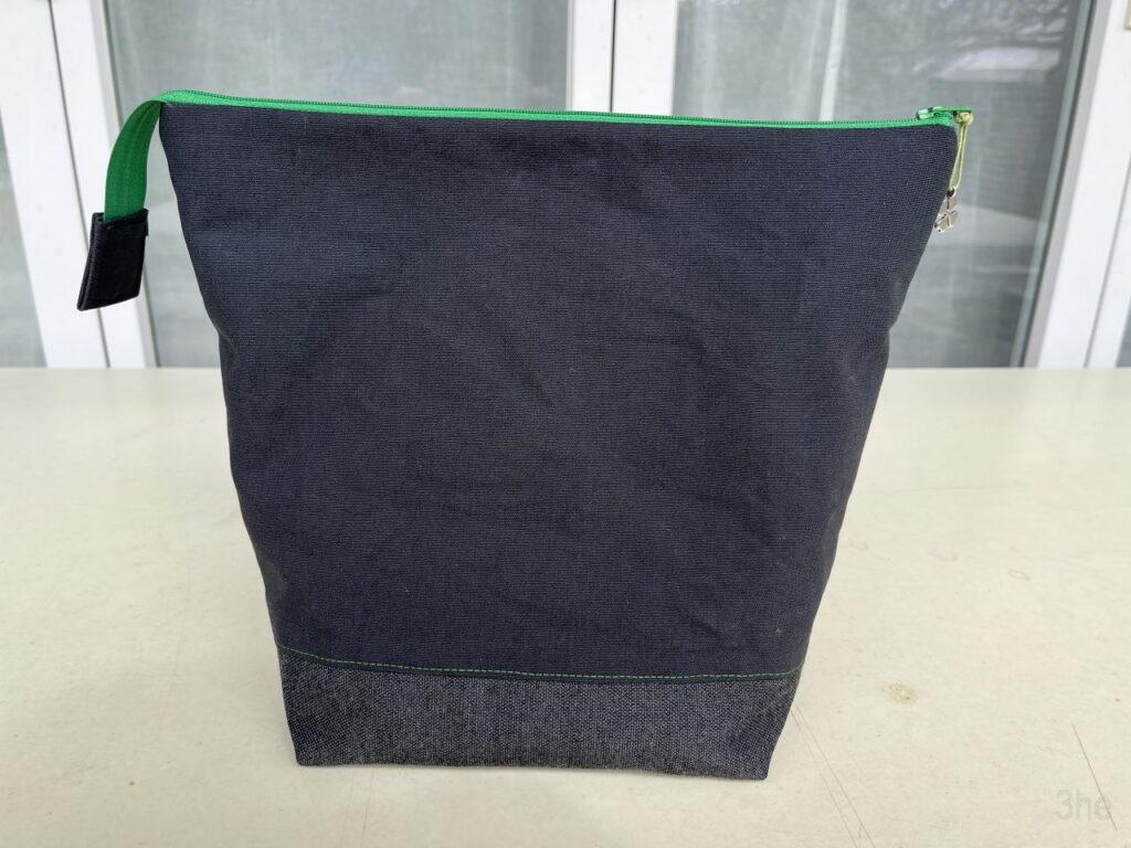 Da das Tascherl als große Waschtasche konzipiert ist, hat sie einen wasserabweisenden Boden aus dunklem Markisenstoff bekommen. Innen besteht die Tasche aus wasserdicht beschichtetem Stoff.
