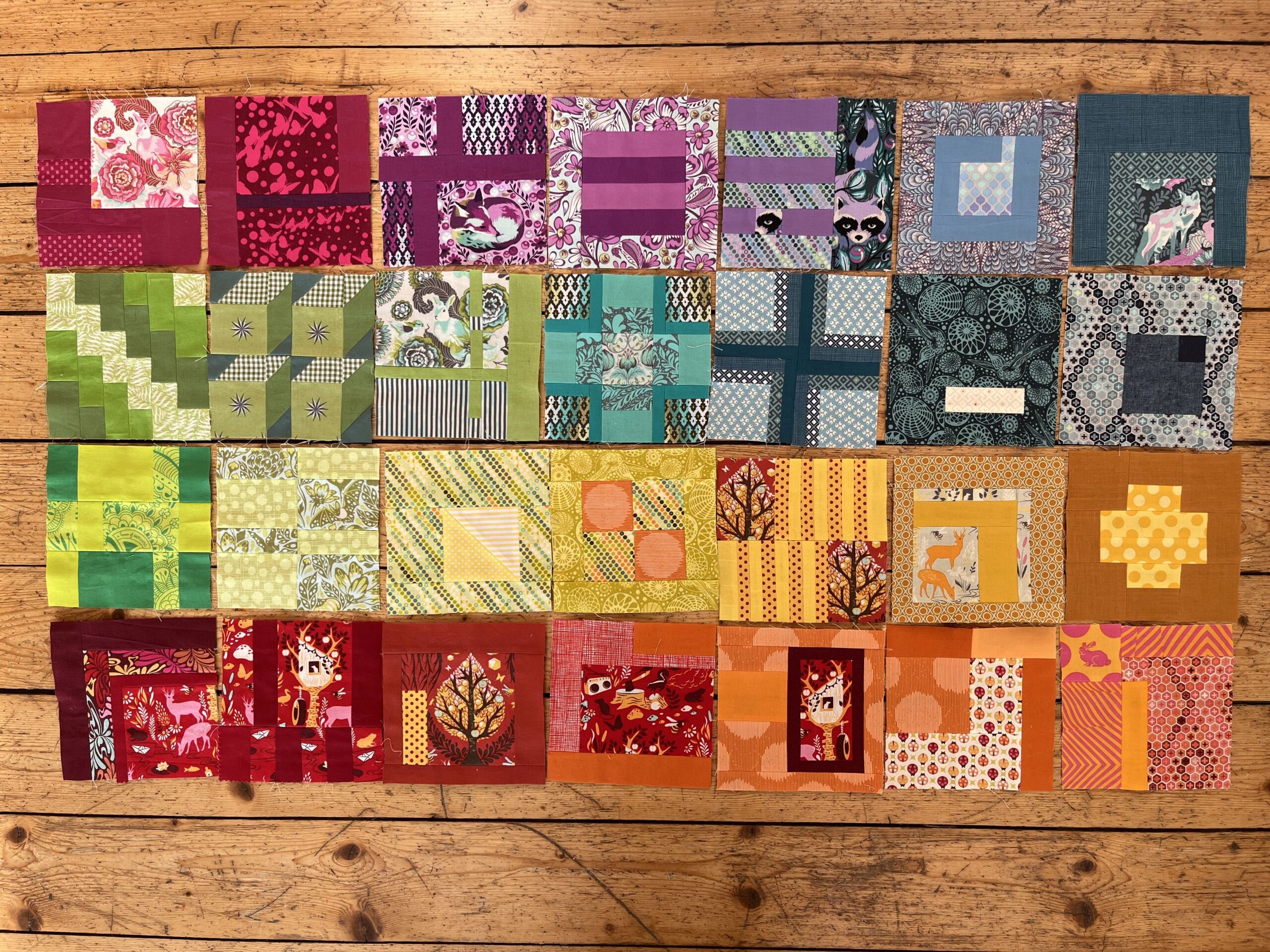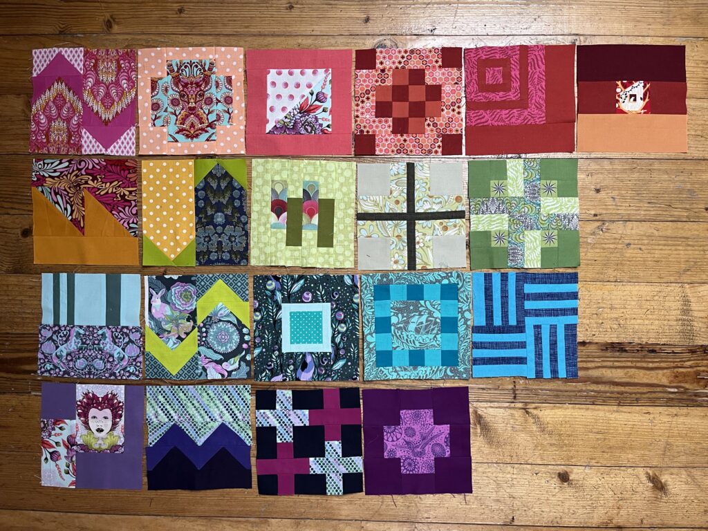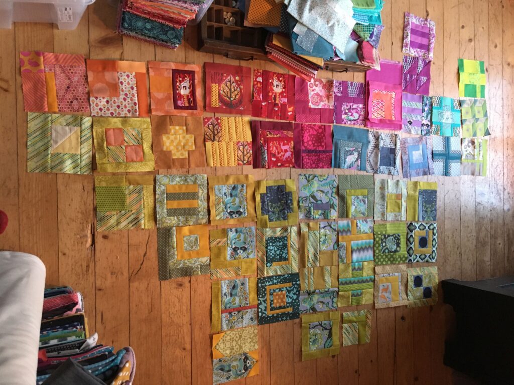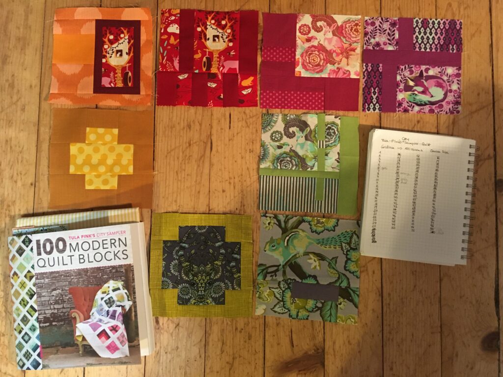 Der Plan war, alle 100 Blöcke in verschiedenen Farben zu machen, ähnlich dem Gridlock genannten Beispiel im Buch, und auch einem ähnlichen Farbverlauf. Die Blöcke jedoch ganz allein meine Zusammenstellung. Schließlich hatte ich ja auch großteils andere Tula Pink Serien und überhaupt andere Stoffe als die Beispielblöcke im Buch. Die zweite Decke sollte aus etwa 64 Blöcken entstehen, eher eine schmale Decke fürs Sofa. Beim Neuanfang habe ich mich dann ganz auf die bunten Blöcke konzentriert. Und auch für das Jahresprojekt möchte ich zunächst nur an den bunten Blöcken weiterarbeiten.