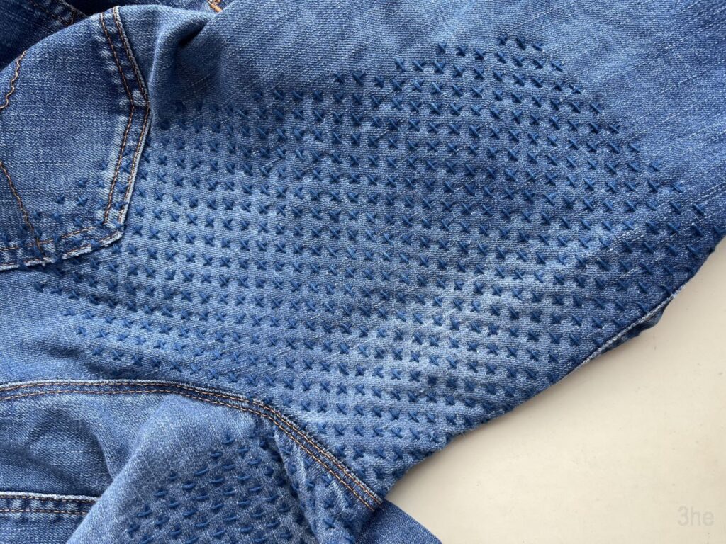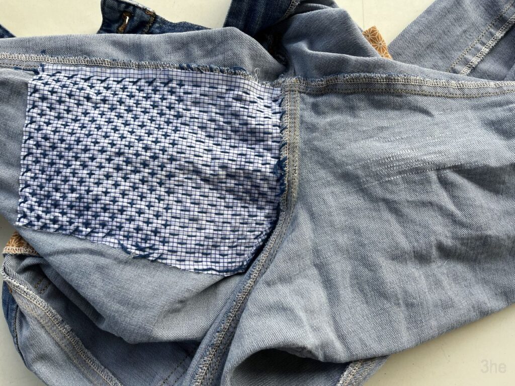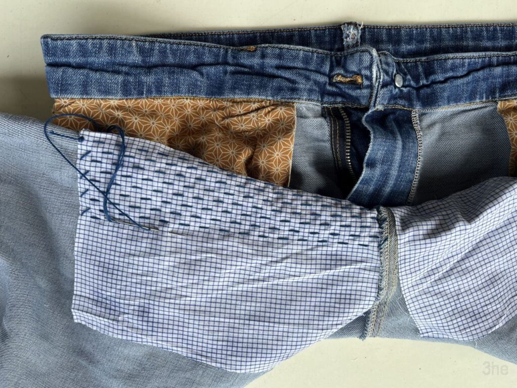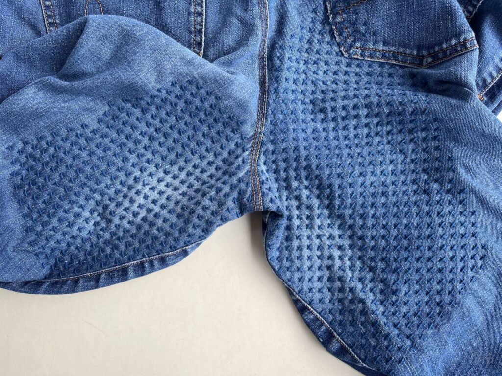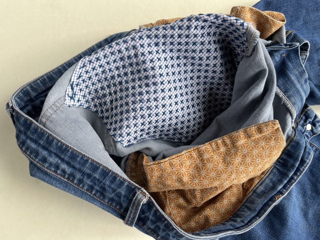 Vielleicht wage ich mich ja an ein anderes Muster. Denn das Schöne an Sashiko ist ja, dass man auch Muster kombinieren kann. Die gleichmäßigen, auf einem geometrischen Raster basierenden Hitomezashi Sashiko Muster wie das hier verwendete Kreuzmuster können noch mit Durchzugsfäden durchwebt werden, das nennt man dann Kuguri Sashiko. Sollte die abgewetzte Stelle also weitere Reparatur benötigen, kann ich sie entweder mittels Kuguri Sashiko verstärken, oder nochmal Muster darüber sticken. Oder in der ebenfalls japanischen Boro-Technik Stoffstücke auflegen und festnähen bzw. besticken. Dann wäre allerdings das darunterliegende abgedeckt. Der Möglichkeiten gibt es also viele. Und da ich die Jeans nun als tragbares Experimentierfeld betrachte, wird da auch sicher noch die eine oder andere Stickerei hinzu kommen.