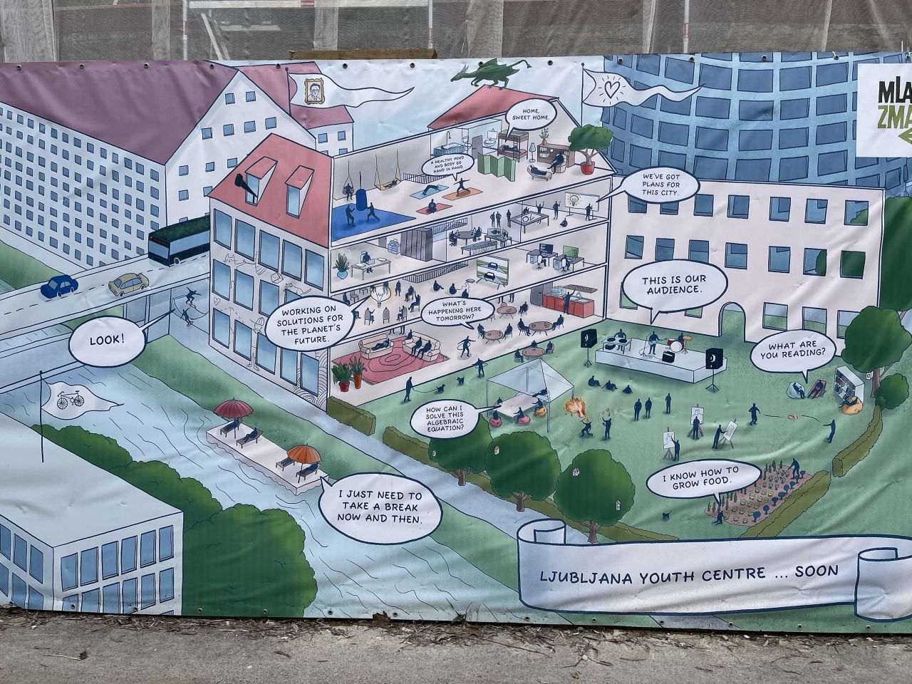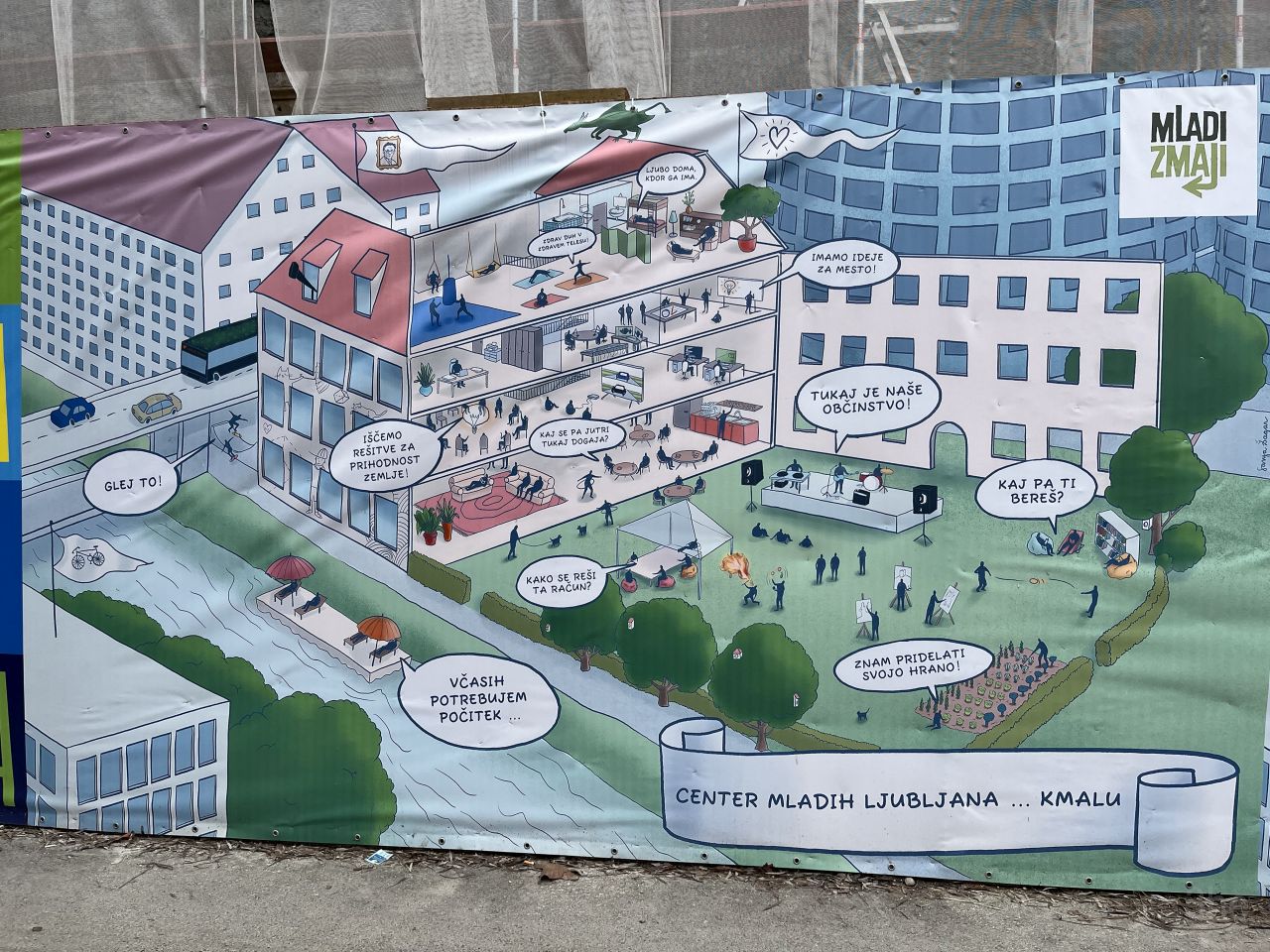 Das Center Rog ist ein Kreativzentrum, das in einem lange leerstehenden ehemaligen Fabrikgebäude errichtet wurde. Der Name Rog kommt dann auch von der Fahrradmarke, die ab dem Ende des 2. Weltkriegs im Gebäudekomplex hergestellt wurde. Die Geschichte des Gebäudes fing jedoch bereits Ende des 19. Jahrhunderts an. 1879 wurde ein 120m langes und etwa 8,5m breites Ziegelgebäude zur Herstellung von Lederwaren errichtet, das bereits 1882 um ein Stockwerk aufgestockt wurde. Unter einem neuen Besitzer, einem Lederhändler, wurde das Gebäude 1900 erweitert und modernisiert. Und zwar wurde es um einen dreigeschossigen Betonskelettbau mit großen Glasflächen für den natürlichen Lichteinfall ergänzt. Es war somit das erste Stahlbetongebäude Ljubljanas. Der namengebende Fahrrad- und Schreibmaschinenhersteller Rog zog mit seiner Fahrradproduktion nach 1945 ein und verblieb bis 1991. Danach wurde die Produktion aufgelassen und das Gebäude stand leer. Bis es um 2006 von mehreren Initiativen quasi besetzt wurde. Mit Duldung der Stadt als neuem Besitzer seit 2002. Die Ideenfindung und vor allem die Finanzierung für die Nachnutzung zog sich in die Länge. Erst 2019 wurde mit dem Umbau begonnen. Ausführlicher und mit ein paar historischen Fotos ergänzt kann man die Geschichte des Gebäudes auf der entsprechenden Seite des Center Rog nachlesen, auch meine Quelle für das hier geschriebene. Und auch der folgende Text, mit dem sich das Center Rog selbst beschreibt, stammt von der Webseite: