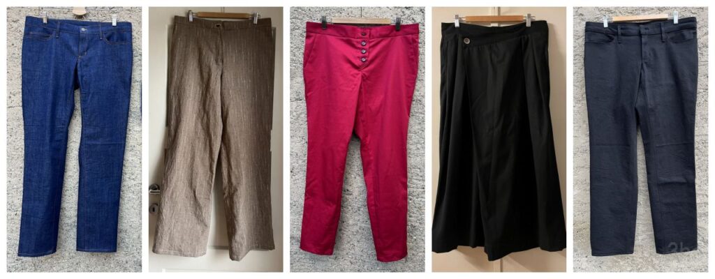 Vor einem Jahr habe ich als Ausblick auf 2025 geschrieben, dass ich vor allem Hosen benötige. Und so habe ich das Nähjahr auch gleich mit einer dringend benötigten Jeans gestartet. Und auch abgeschlossen. Dazwischen habe ich noch weitere Hosen genäht. Als da wären (von links nach rechts):