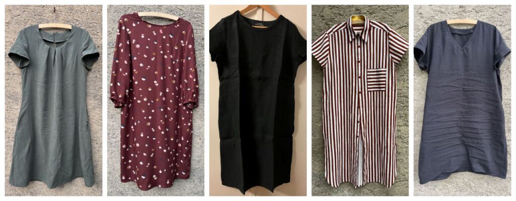 Kleider trage ich vor allem im Sommer. Was Kleider für Winter und Übergangszeit angeht sieht es momentan aber auch recht mau aus im Kleiderschrank. Von Anlasskleidung gar nicht zu reden, aber die nähe ich dann wenn es notwendig werden sollte. Wenn ich mir die Kleider aus 2025 so ansehe, stelle ich fest dass ich meine vorherigen Nähpläne ziemlich ignoriert habe. Alle sind aus im Jahr 2025 gekauften Stoffen entstanden, und der Schnitt nach dem Stoffkauf ausgewählt worden. Ach nein, doch nicht ganz. Der schwarzgraue Tencel ganz rechts lagerte schon mindestens 3 Jahre im Stoffschrank. Und beim Hemdblusenkleid habe ich den Stoff zum ausgewählten Schnitt gekauft.