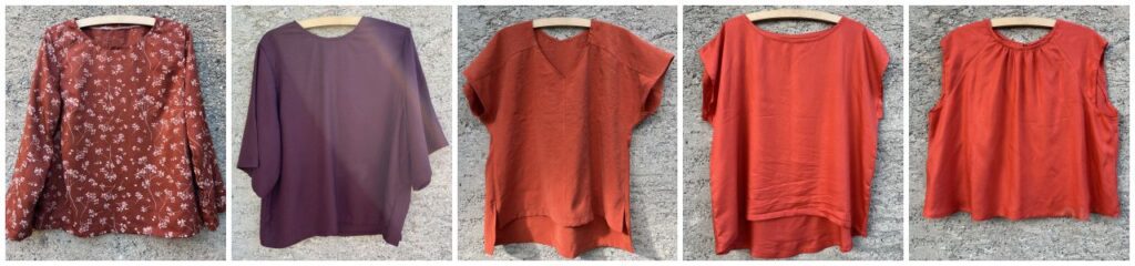 Wie nicht anders zu erwarten habe ich natürlich wieder eine Bluse Robinia genäht. Die anderen Oberteile sind luftige Sommertops. Erst jetzt in der Übersicht fällt mir die abgestimmte Farbpalette auf. Die Oberteile sollten aber auch gezielt zur beigen Hose Miller Street (eigentlich so gar nicht meine Farbe und deshalb umso mehr mit kräftigen Farben aufzupeppen) und zu einem ebenfalls im Sommer genähten Rock passen.