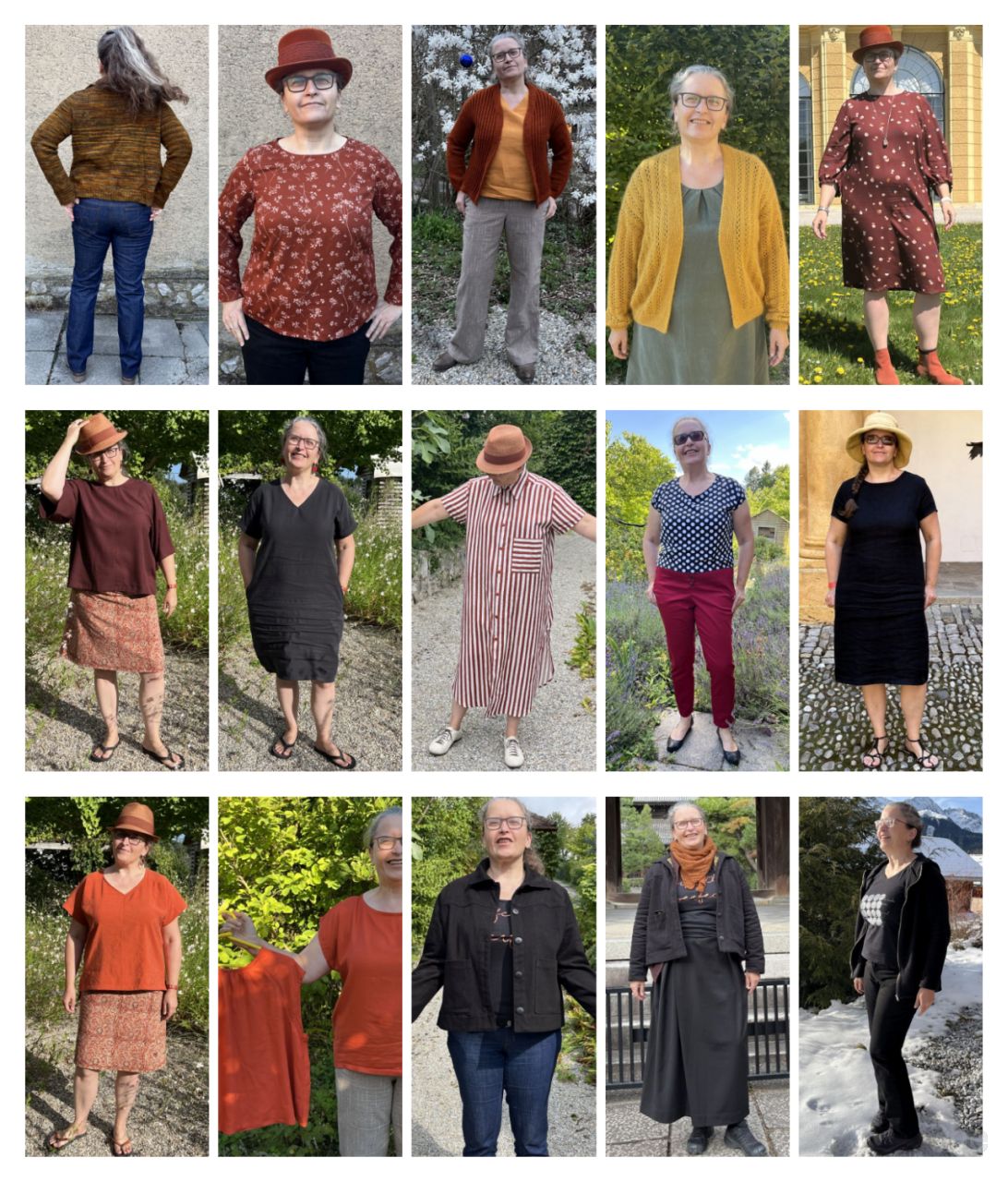 2025 sind also insgesamt 20 neue Kleidungsstücke für mich entstanden. 5 Hosen, 5 Kleider, 5 Oberteile, 1 Rock, 1 Jacke und 3 Strickjacken. Die gleiche Anzahl 5 bei Hosen, Kleidern und Oberteilen ist übrigens ein Zufall. Es sind 2 dominante Farbgruppen erkennbar. Einerseits ist recht viel in Schwarz entstanden und damit einige sehr gut kombinierbare Teile. Andererseits ist auch das Rotorangebraun-Spektrum recht gut vertreten.
