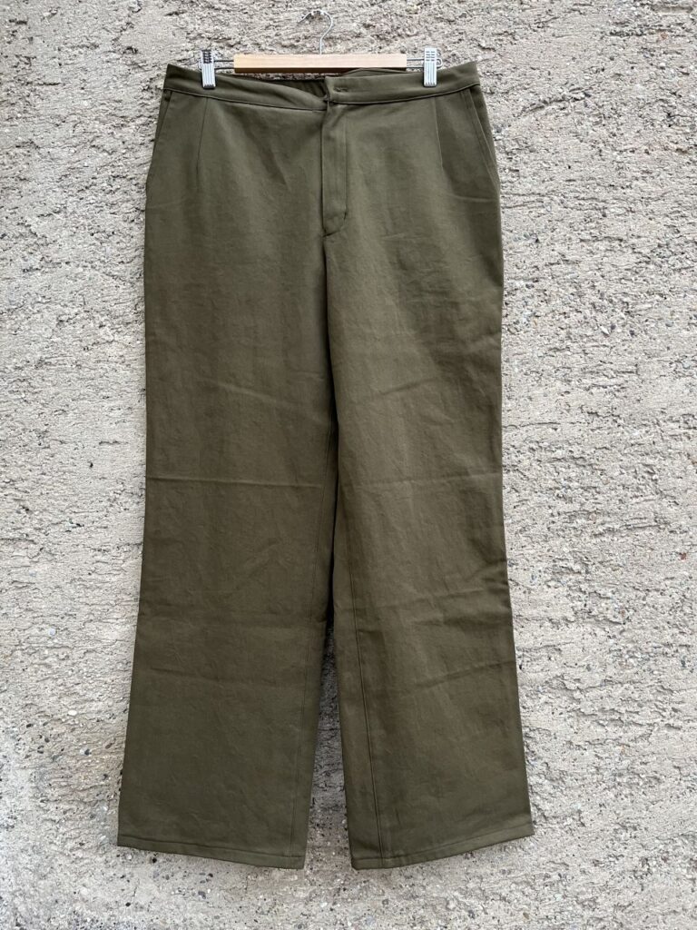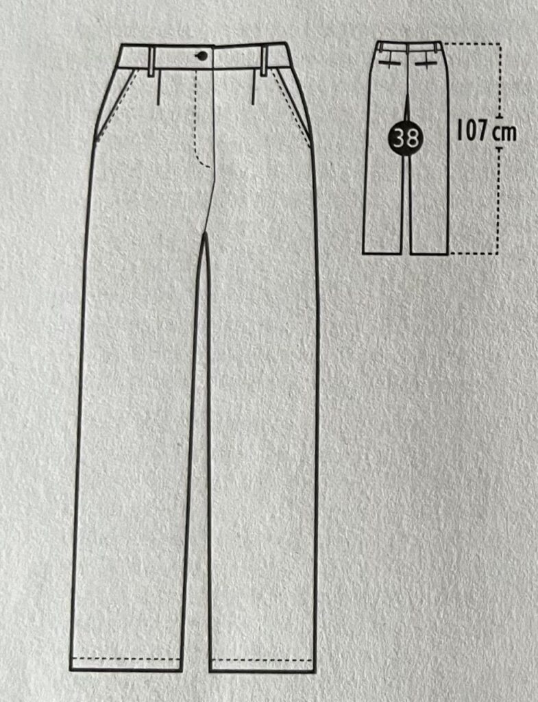 Der Schnitt Miller Street aus Ottobre 5/2023 führt zu einer Hose mit hohem Bund und geraden weiten Beinen. Zwei Abnäher vorne und zwei Abnäher hinten führen zu einer angenehmen Passform. Vorne gibt es zwei Hüftpassentaschen, hinten zwei Paspeltaschen. Schlicht und geradlinig ohne weitere Auffälligkeiten.