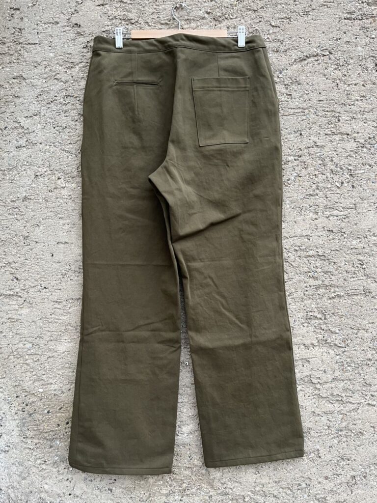 Eine Änderung gab es außerdem bei den Taschen. Erst bei der zweiten Hose nach dem Schnitt habe ich bemerkt, dass etwas mit dem Schnittteil für die Paspeln nicht stimmen kann. Denn die beiden Paspeln am Tascheneingriff werden sehr schmal. Extrem fummelig zu nähen, der Tascheneingriff klafft immer auf, und selbst auf den Fotos im Heft sind die Paspeln breiter. Ich fürchte, das stimmt das mit der Beschriftung, dass die Nahtzugabe bei den Paspeln inbegriffen wäre einfach nicht. Eine Paspeltasche habe ich genäht, die zweite wollte ich mir nicht mehr antun. Kurzentschlossen habe ich das Schnittteil der Gesäßtasche der Archer Trouser verwendet und als zweite Gesäßtasche eine Aufsatztasche angebracht. Leider etwas zu hoch, weil ich die bereits angebrachte Verstärkung der Paspeltasche für die Ecken verwenden wollte.
