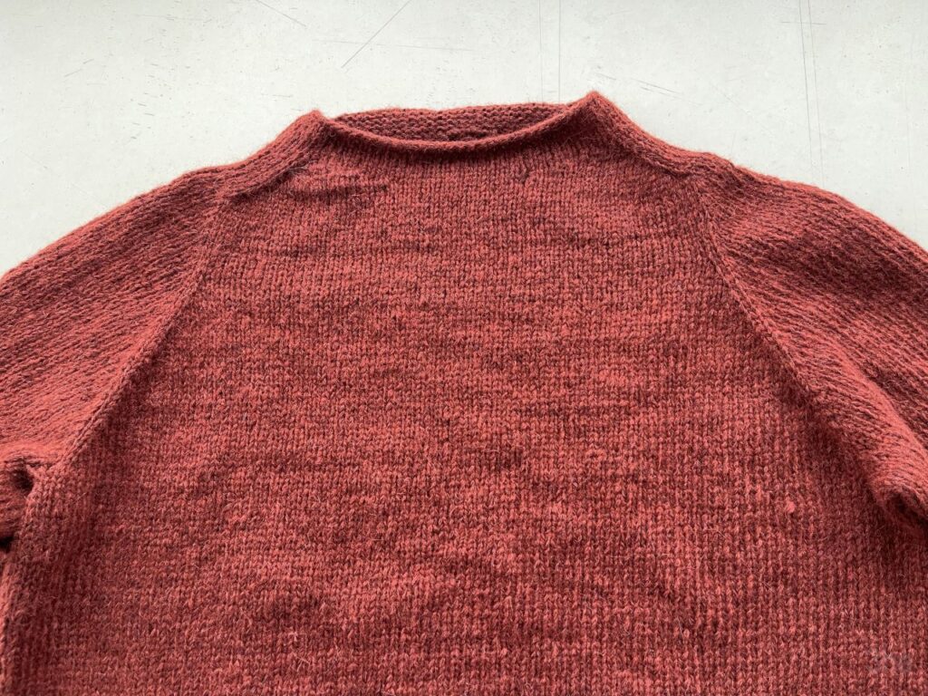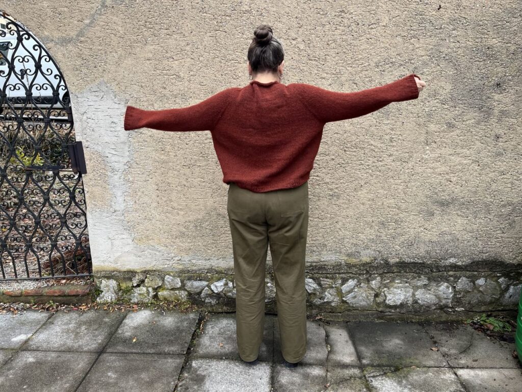 Was mir sehr gut gefällt ist die Schulterpartie, die dann in eine Raglanlinie übergeht. Die verkürzten Reihen am Halsausschnitt beulen an einer Seite etwas, da würde vermutlich Anfeuchten und Spannen, das ich mir bisher gespart habe, etwas Abhilfe schaffen.