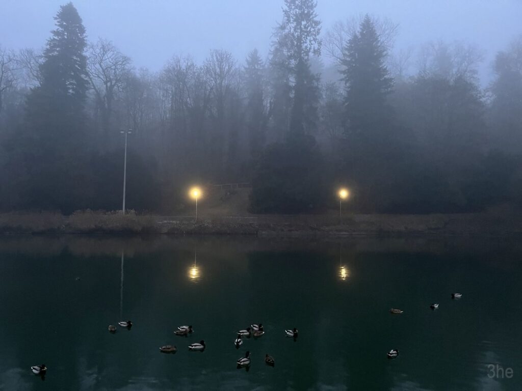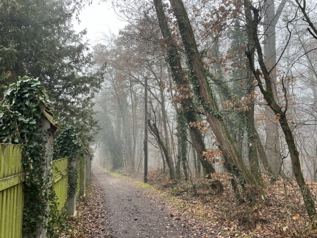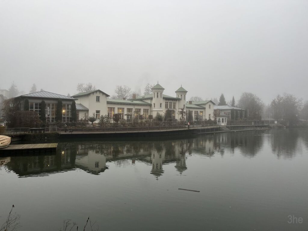 Zurück kommen wir am anderen Ende des Hilmteichs aus dem Wald als wir gestartet sind. Auch rund um den Hilmteich ist der Nebel inzwischen wieder präsent. Die Gebäude hinter dem Hilmteichschlössl sieht man im Nebel gar nicht. Es wirkt alles ein bisschen unwirklich.