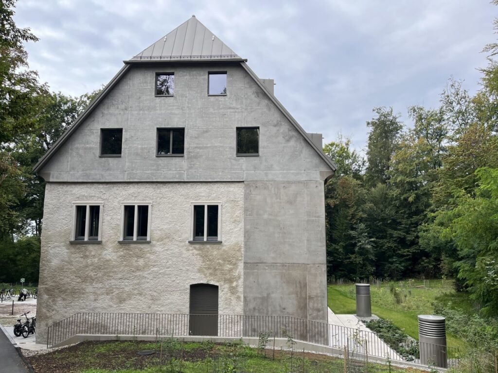 Das hat vor allem der Denkmalpflegerinnenseele im Körper einer Architektin sehr gut gefallen 🙂 Die reduzierte Architektur in grüner Umgebung, das hat schon was. Und ich konnte die Frage einer weiteren Besucherin am Tag des Denkmals zum Namen der Gauben beantworten, die die Verbindung Gerber zur Gaube und zum Gebäude wissen wollte. Mit dem Gebäude haben die Gerber nichts zu tun, aber eben mit der langgestreckten Gaube. Denn die hohen steilen Dächer der zumeist in Flußlage am Stadtrand situierten Gerberhäuser verfügten meist über mehrer Geschosse mit beidseitig solch langgestreckten Gauben mit Öffnungen ohne Fenster, um die Luft durch die zum Trocknen aufgehängten Häute streichen zu lassen. Auch von Hopfen- oder auch Tabakanbaugebieten (wenn nicht in Tabakscheune getrocknet) kennt man sowas, dann meist niedriger. Hier nun sind es Belichtungsbänder für die vielen in den Dachgeschossen untergebrachten Arbeitsplätze. Das Ganze in belebt würde mich auch interessieren, dazu müsste ich dann aber mal an einem Arbeitstag hinspazieren. Wird sich irgendwann ergeben, und dann werde ich berichten.