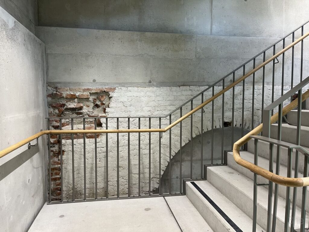Da es von unserem Haus ein netter Spaziergang durch ruhige Gassen ist, bin ich zu Fuß zum Rosenhain gegangen. Und nähere mich dem ehemaligen Jesuitenrefektorium von oberhalb.Näher dran sieht man dann die Ergänzungen. Die wiedererrichteten Giebel und der ebenso wiedererrichtete Arkadengang wurden in Dämmbeton ausgeführt und die neue Materialität bewusst vom ausgebesserten und geschlämmten Bestandsmauerwerk abgehoben.Die Fenstergewände und das Eingangsportal waren ebenso wie die Mehrzahl der Fenstergitter im Erdgeschoss dank Vermauerung noch vorhanden. Jahrzehntelange Durchfeuchtung bekommt Mauerwerk nicht sonderlich gut. Die Restauratoren waren dann auch fast die gesamte Bauzeit vor Ort und unter anderem mit der Ziegelsanierung beschäftigt. Die nun als Oberfläche aufgetragene Kalkschlämme sperrt das Mauerwerk nicht ab, die Restfeuchte kann weiterhin entweichen. Die auftretenden Feuchteflecken mögen manche vielleicht stören, sind jedoch verträglicher als durch die Feuchte ausgelöste Putzabplatzungen bei üblichen Putzen. Die breiten Dachgauben, sogenannte Gerbergauben, sind nicht historisch für dieses Gebäude, jedoch notwendig, um Tageslicht in die beiden Dachgeschosse mit den Arbeitsplätzen der Mitarbeiter zu bringen.Die Fenstergitter hingegen sind historisch und wieder saniert. Und jetzt endlich geht es dann auch durch das erhaltene und restaurierte Eingangsportal in das Gebäude.Das Erdgeschoss beherbergt hauptsächlich den großen Hörsaal. Die Betonplattendecke ist neu, in diesem Bereich war keine Decke mehr vorhanden. Das Bestandsmauerwerk wurde innen zwischen den Fenstern mit vorbetonierten Lisenen und Trägern statisch ertüchtigt. Und natürlich auch unterfangen.Der nordseitig wiedererrichtete Laubengang dient haupsächlich der Erschließung der Räume in den Geschossen. Die hier zu sehende Stiege verbindet nur die beiden Vollgeschosse, während die hier im Rücken liegende und als eigener Abschnitt ausgeführte zweite Stiege alle Geschosse inklusive der beiden Dachgeschosse verbindet. Hier sind auch die zusätzlich betonierten statischen Lisenen gut zu sehen.Großraumbüro im obersten, zweiten, Dachgeschoss. Statische Rippen im unteren, ersten, Dachgeschoss bewirken dort, dass es nur kleinere Büros gibt. Leider war der Bereich wegen der Bezugsmaßnahmen abgesperrt. Wie dieser Raum hier auch, aber große Glastüren boten hier Einblick. Ebenfalls auf diesem Geschoss untergebracht ist ein großer Sozialraum.Stiege zwischen 1. und 2. Dachgeschoss. Mit Blick ins Grüne.Stiege zwischen 1. und 2. Geschoss. Die Anschlussbereiche des ursprünglichen und früh abgetragenen Arkadengangs wurden bewusst erkennbar gehalten.Viele der ursprünglichen Türgewände sind erhalten, wenn auch stark verwittert und konservierend restauriert, die Öffnungen wurden jedoch großteils umverlegt und die bestehenden zugemauert. Die Öffnung rechts führte ehemals in den Keller, der nun nur noch von außen erreichbar ist und die Haustechnikanlagen und einen Fahrradabstellraum beherbergt.Kellerfenster und Traufbeet.Das Gebäude liegt mitten im Erholungsgebiet Rosenhain, eine Zufahrt ist nur minimal für Anlieferungen möglich. Deshalb gibt es zwar viele Fahrradabstellplätze, jedoch keine Parkplätze. Und einen einzigen barrierefreien Parkplatz.Das Gebäude von der Rückseite bzw. der Arkadengangseite. Die kleine Lichtung, die durch die Bautätigkeit entstanden ist, wird wieder aufgeforstet, die Bäumchen und Sträucher sind bereits gesetzt.Nach einem netten und sehr informativen Gespräch mit den beiden Restauratoren zum Abschluss nutze ich den Sonnenschein und gehe auch die wenigen Meter hügelan noch zum Café Rosenhain.Ohne Frühstück aus dem Haus, da darf es dann auch gerne ein Kuchen zum Kaffee sein.Etwas zugewachsener aber nichtsdestotrotz schöner Ausblick über Graz mit Uhrturmblick inklusive. Dann mache ich mich auf den Heimweg.Eine Woche später haben wir mit Besuch den Spaziergang zum Jesuitenrefektorium und Rosenhain nochmal unternommen. Das Gebäude leider nur von außen, da Sonntag und geschlossen, aber immerhin. Mit Rückweg durch nochmal eine andere Gasse wird der Spaziergang zu einem Rundweg. Beide Male gäbe es vom Spaziergang selbst auch noch ein paar nette Impressionen, jedoch, die maimale Anzahl von 25 Fotos ist erreicht.