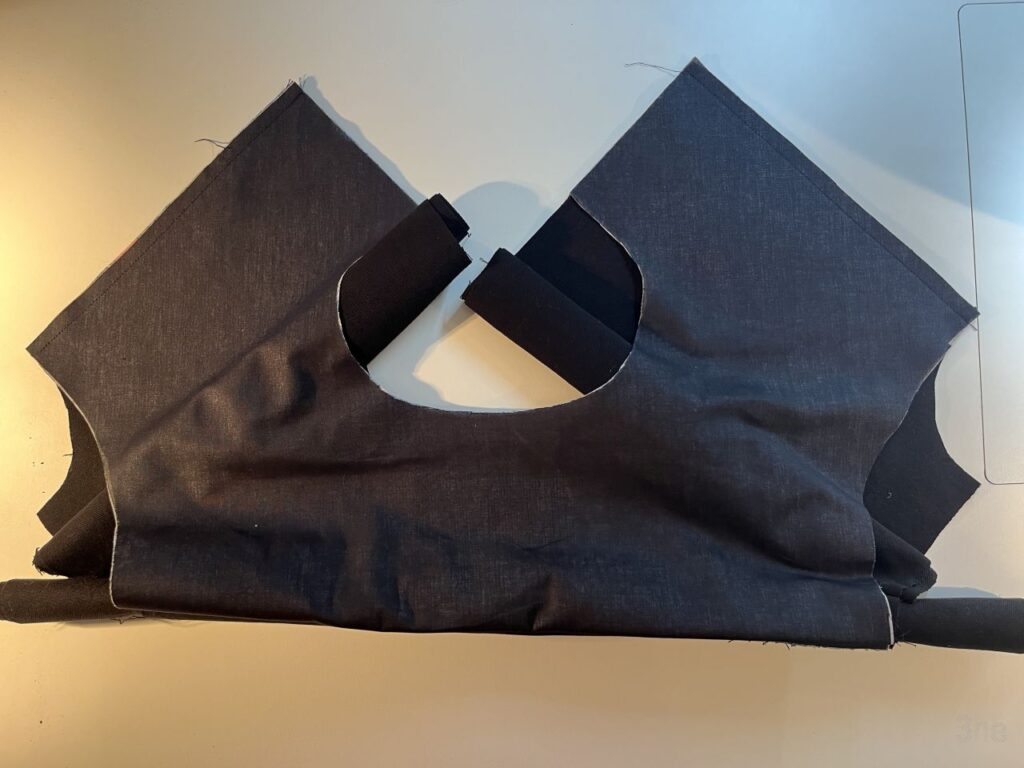 Die Jacke ist zwar ungefüttert, aber die Schulterpasse ist gedoppelt. Und sie wird ebenso wie der Kragen und die Belege für Knopfleisten, Bund und Ärmelsaum verstärkt. Das Verstürzen der Schulterpasse mit der Burrito-Methode wird im Booklet mit der Anleitung in Text und Zeichnung gut erklärt.