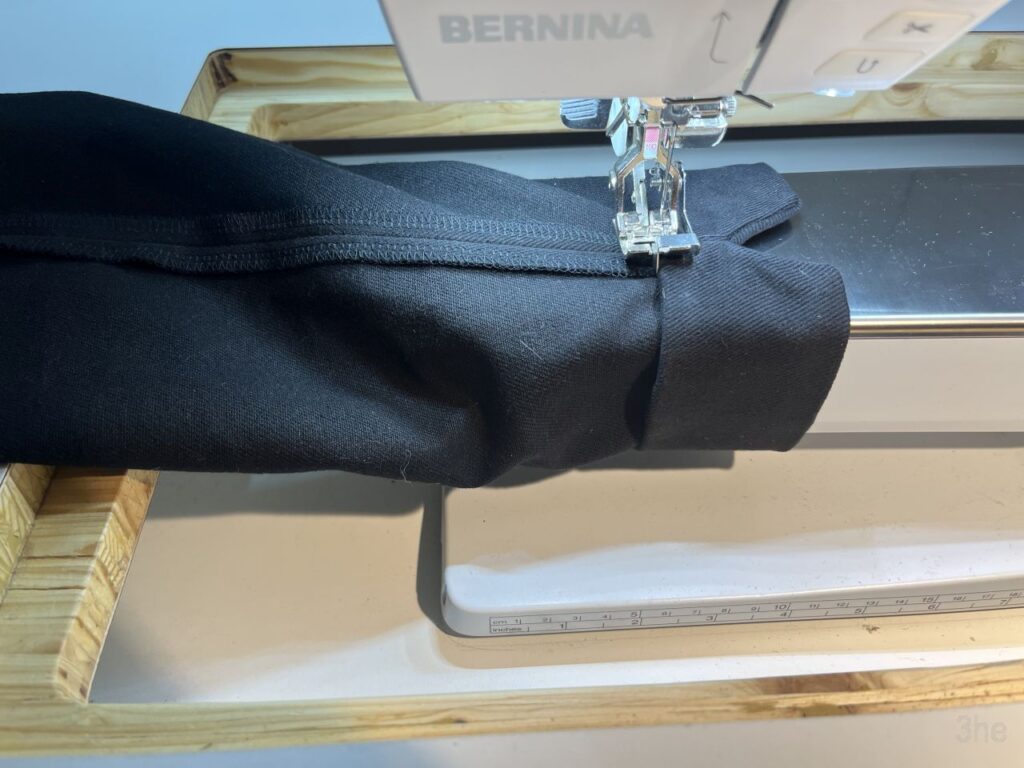 Der zum Quilten vorteilhafte Einbau der Nähmaschine in die große Tischplatte macht es erforderlich, zur Nutzung des Freiarms die Abdeckplatte direkt um die Nähmaschine zu entfernen. Der Ärmel passte dann zum Absteppen auch gerade so über den Freiarm. Auch gut zu sehen ist hier der Beleg am Ärmelsaum und der kleine Ärmelschlitz.